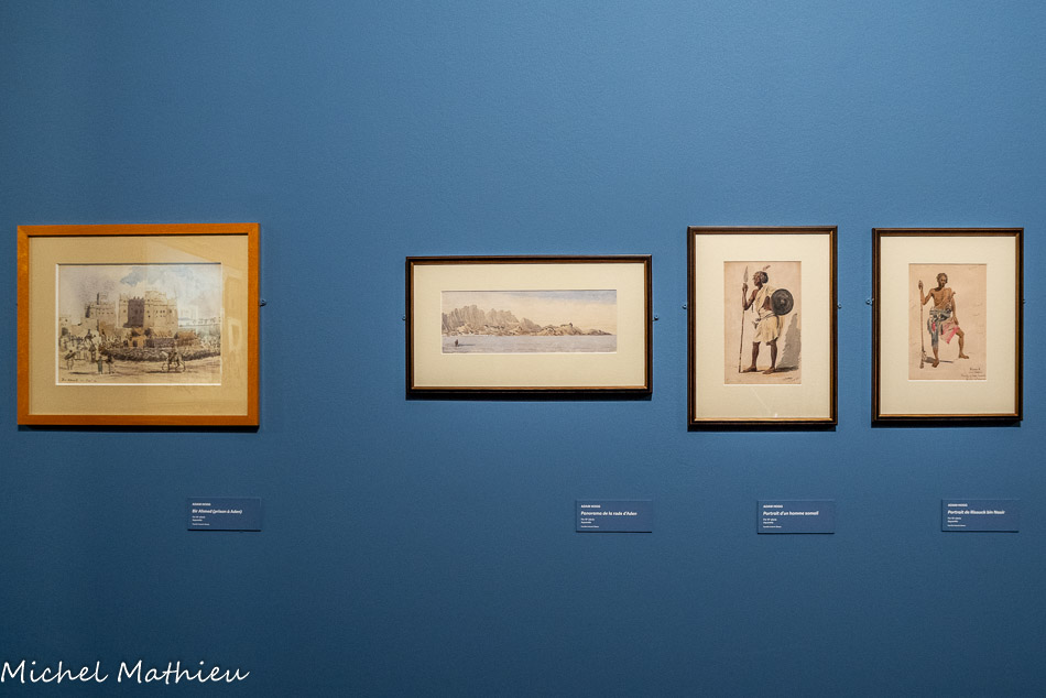 Fin 19e siècle. Aquarelle. Famille Antonin Besse. De gauche à droite : Bir Ahmed (prison à Aden) ; Panorama de la rade d'Aden ; Port ait d'un homme somali ; Portrait de Rissuck bin Nasir.
