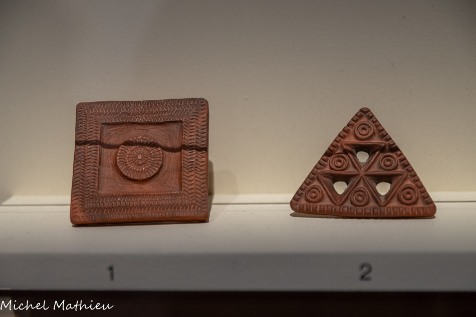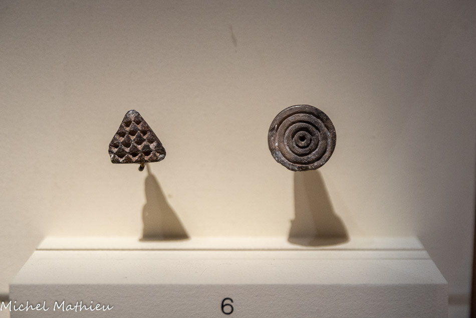 Fibule à motifs : de croissants de lune, de poissons et de grenades.
