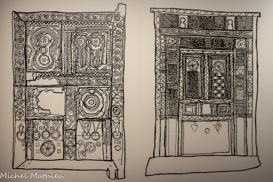 Dessins et photographies de portes de l’Anti-Atlas avec schéma des figures triangulaires stylisées et du carré central figurant un œil apotropaïque. Verrous.