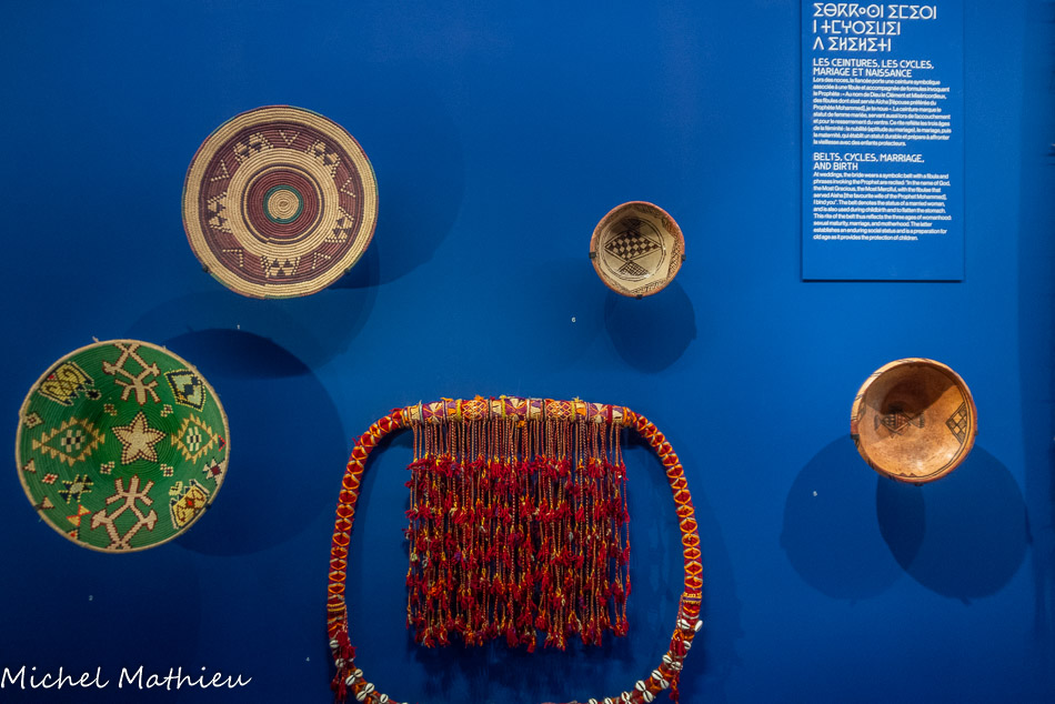 Cuir, argent, corail, cauris, pièces de monnaie Fondation Jardin Majorelle, Marrakech, Maroc