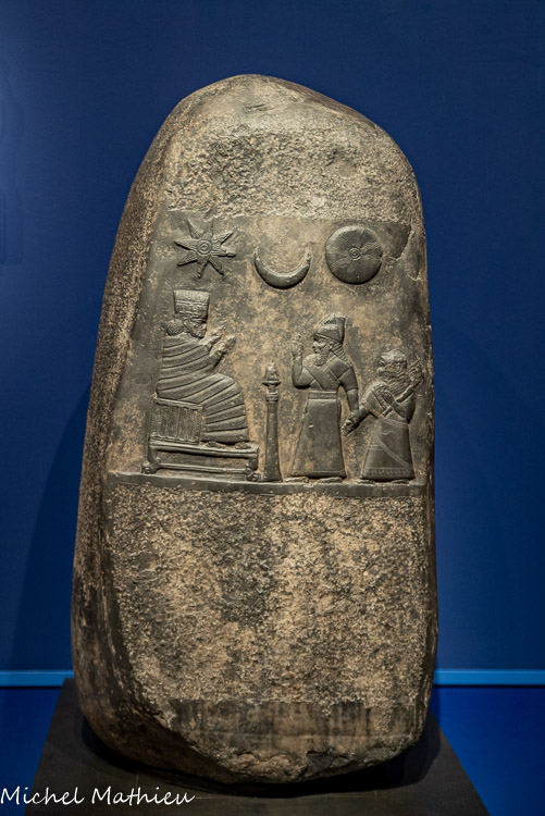 Sur ce kudurru, stèle délimitant un terrain, sont représentés les symboles de divinités astrales : Ishtar (Vénus), Shamash (le Soleil) et Sin (la Lune).