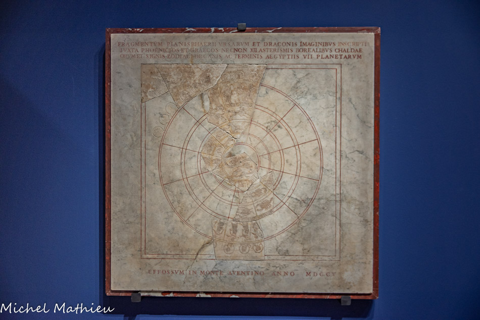 Ce planisphère romain est un rare assemblage de différentes visions du zodiaque en Méditerranée. Autour des constellations polaires (les Ourses et le Dragon) se trouvent un cercle avec les images du zodiaque mésopotamien, deux cercles avec celles du zodiaque grec, puis des divinités égyptiennes liées au calendrier, et enfin les personnifications des sept planètes.