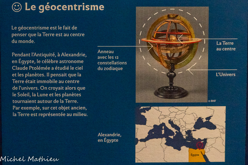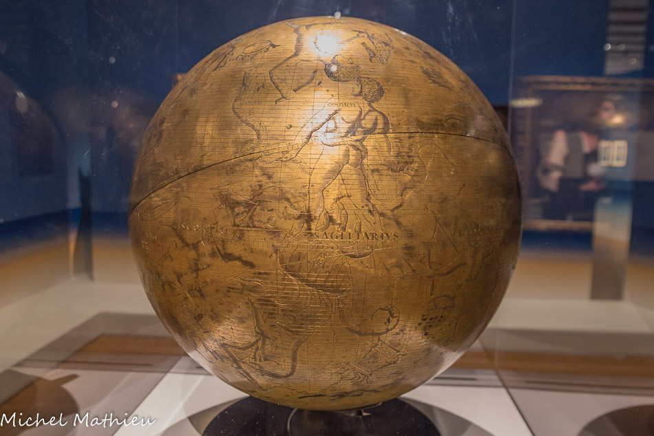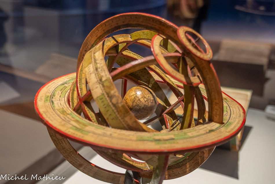 Bibliothèque nationale de France, département des Cartes et plans, Paris. . Au centre, le Terre. Sur l'anneau en bas, à gauche, le nom des villes et leur longitude et latitude. Sur l'aneau central incliné, les mois de l'année et les constellations du zodiaque.
