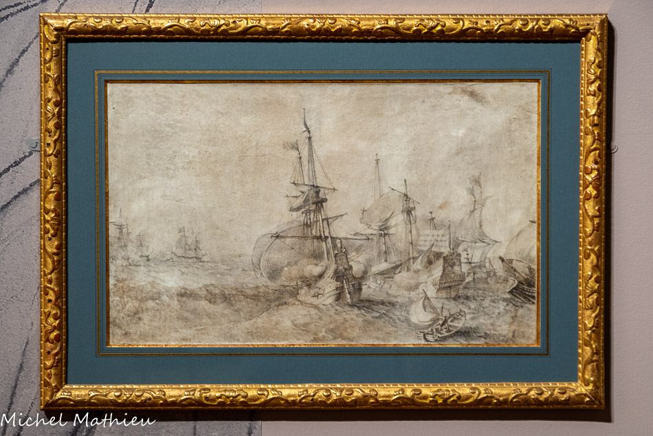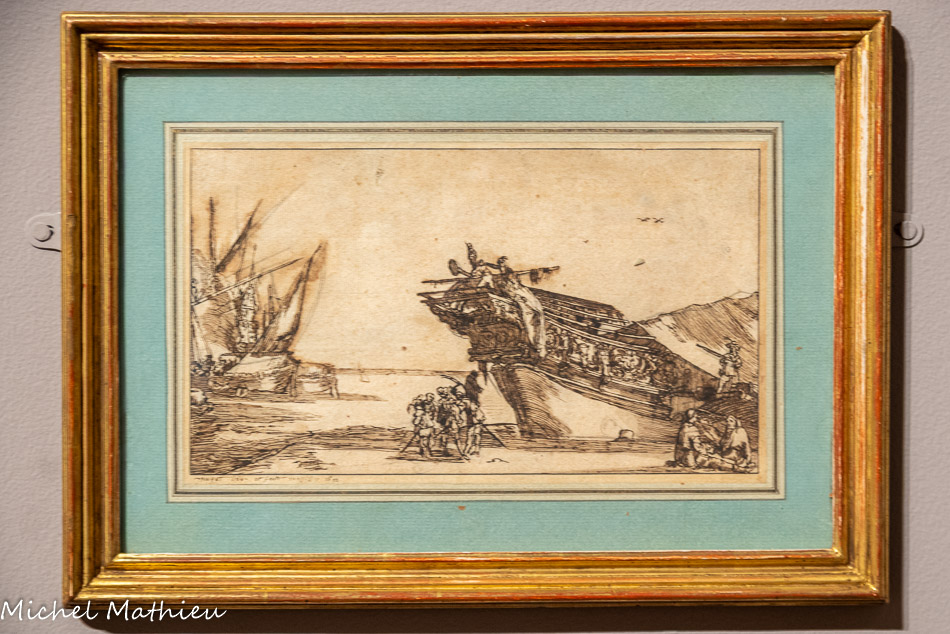 Ce dessin est la preuve la plus flagrante d'une des sources de Puget dessinateur de marines. Il s'agit de la copie qu'il a faite d'une gravure de Stefano della Bella (1610-1664), célèbre artiste italien dont les œuvres sont diffusées dans toute l'Europe. Elle est tirée de sa Suite de huit marines gravées en 1634. Stefano della Bella se plaît à décrire la vie pittoresque des ports de guerre avec ses figures à la marge de la société, soldats et galériens, dont Puget reprendra les motifs au premier pian de la plupart de ses dessins.