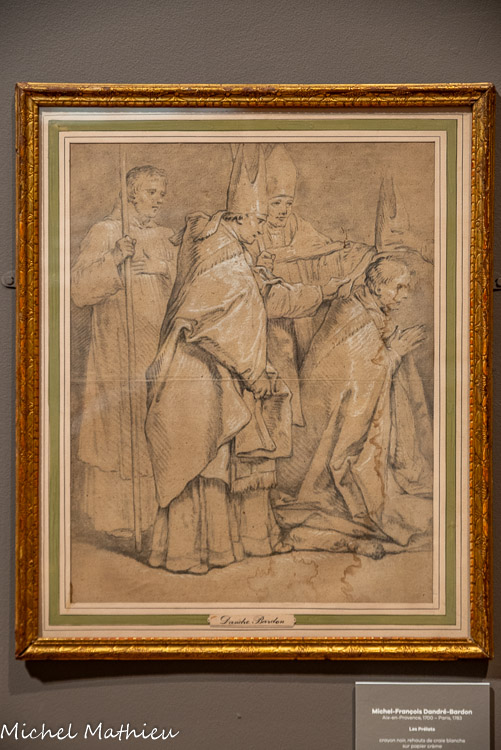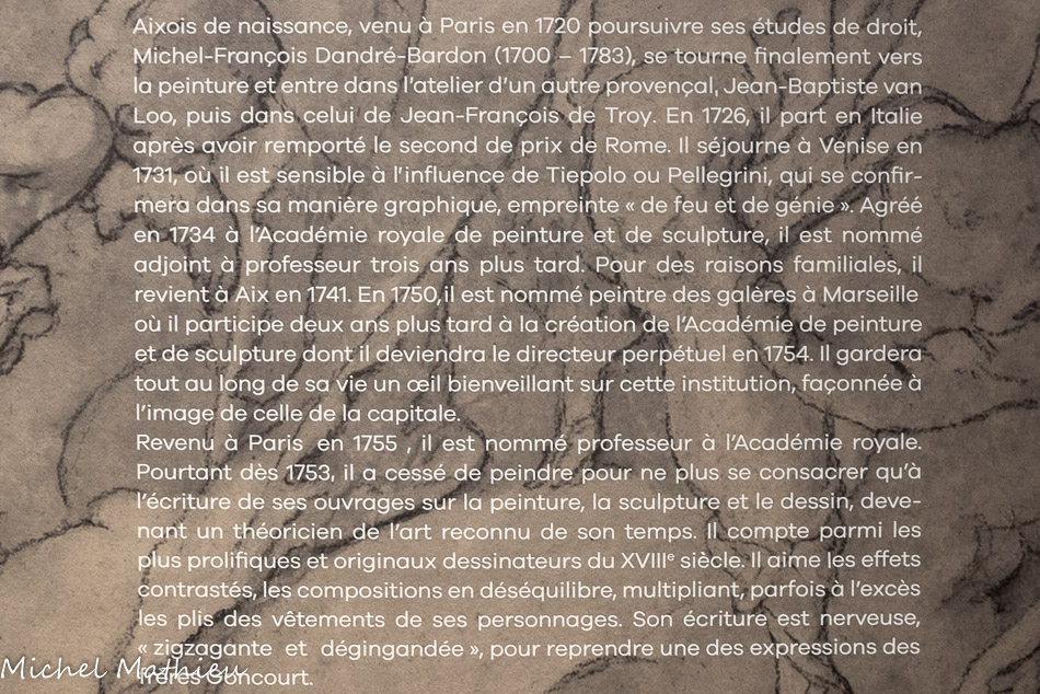 En 1753, Dandré-Bardon présente au Salon (n° 49), une Mort de Socrate, dont on ne connaît aujourd'hui que les esquisses. Pour réaliser cette œuvre, représentant l'épisode ultime et tragique de la vie du philosophe, dont le thème et la portée morale allait séduire plus tard les peintres néoclassiques, Dandré-Bardon dessina plusieurs études préparatoires. Quatre étaient connues à ce jour. Les deux études présentées ici sont inédite. Elles nous renseignent un peu plus sur les différentes étapes de la réflexion du peintre avant la réalisation finale de son tableau. Conformément au récit de Platon, le philosophe est représenté dans sa prison, assis sur son lit, entouré de ses amis avec lesquels il discourt une dernière fois, après avoir bu la ciguë, poison donné aux condamnés à mort à Athènes.