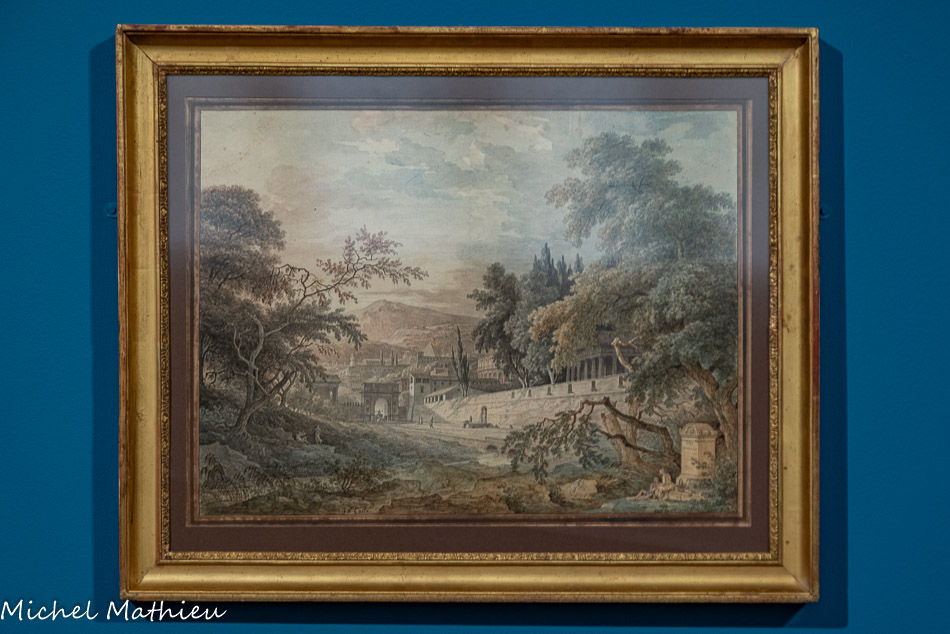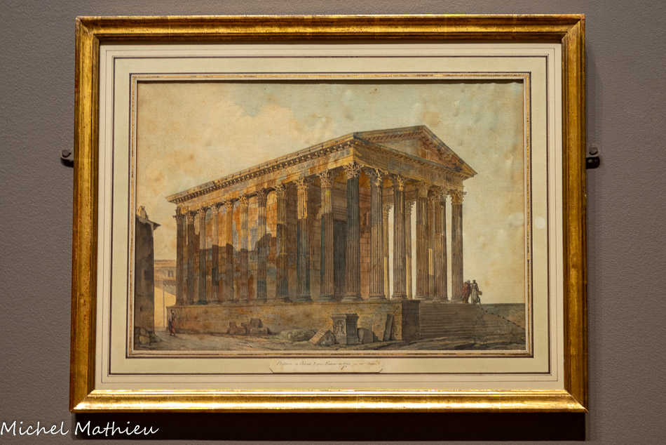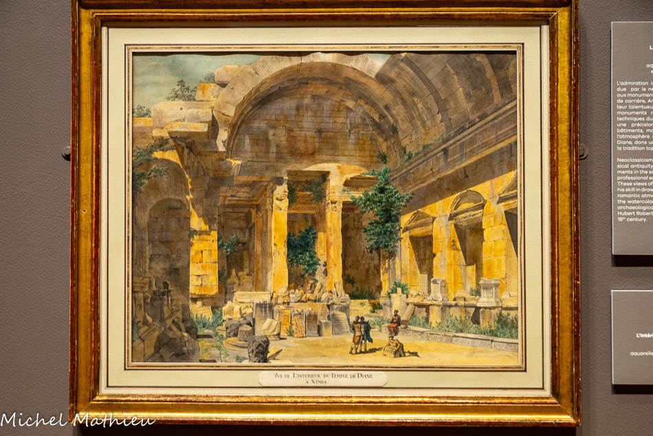 L'admiration inconditionnelle pour l'antique défendue par le néo-classicisme réactive l'intérêt porté aux monuments romains du sud de la France. Militaire de carrière, Antoine Chantron est aussi un dessinateur talentueux. Ces vues de deux des plus célèbres monuments nîmois témoignent de sa maîtrise des techniques du dessin. Il restitue non seulement avec une précision archéologique, l'architecture des bâtiments, mais grâce aux couleurs de l'aquarelle, l'atmosphère romantique des ruines du temple de Diane
