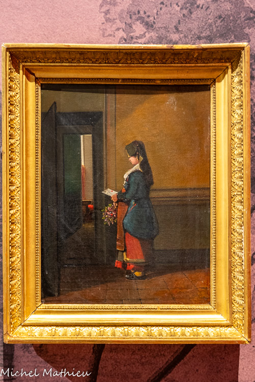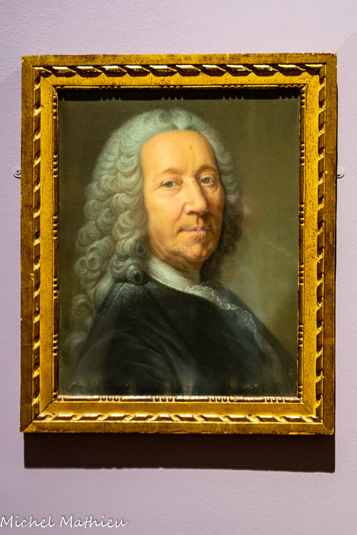 Issu d'une famille de ciseleurs, Pierre Bernard choisit la peinture et devient peintre des galères de l'Arsenal de Marseille en 1733. Il s'installe ensuite â Paris, ou il est reçu à l'Académie de Saint-Luc on 1760. Ce portrait, qui doit dater de sa dernière période d'activité, après 1765 1769, illustre une évolution vers un style plus naturel : la pose est détendue, le traitement du visage est fluide, et le rendu illusionniste des matières, tissu ou fourrure est parfaitement maîtrisé. La palette réduire de bleus et de blancs sur un fond sombre met valeur la figure, dans une élégante harmonie.