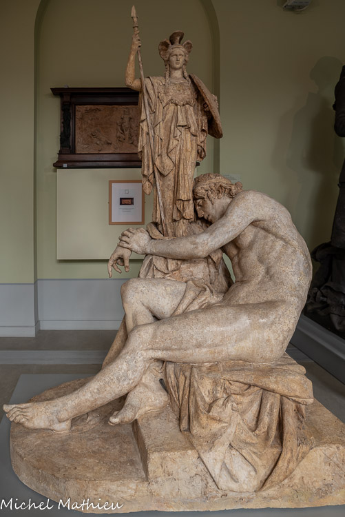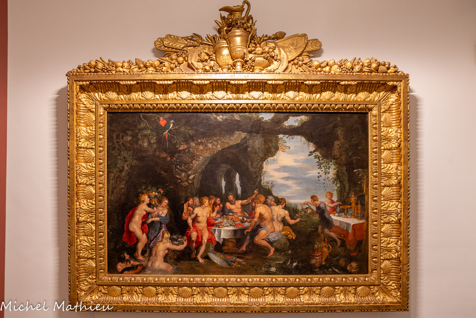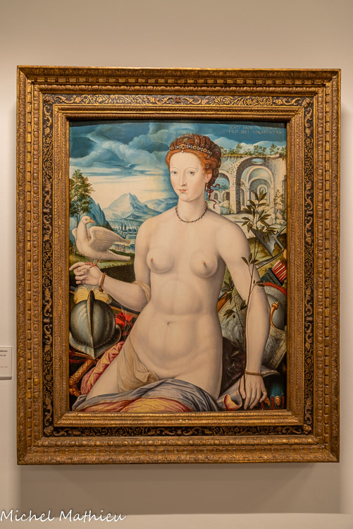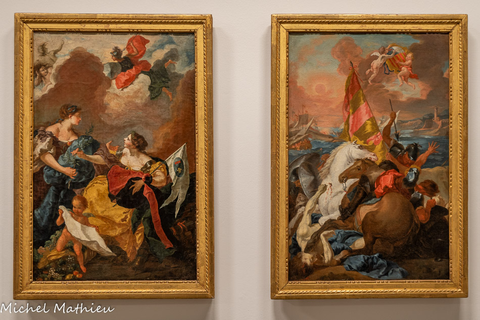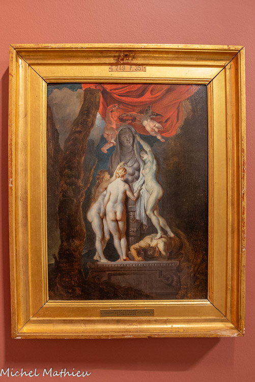 Dans la peinture mythologique, l'artiste reprend des sujets et des personnages de la mythologie gréco-romaine, issus des textes littéraires antiques, mais il les interprète avec une grande liberté. La Toilette de Vénus de l'École de Fontainebleau [n°8], audacieuse composition pyramidale de grands nus couronnée de lourds rideaux verts, oscille entre mythologie et allégorie, démonstration et dévoilement, et fascine par l'atmosphère raffinée et précieuse qu'elle dégage. Plus tardif, le Mars et Vénus de Nicolas Mignard [n°9] qui s'inspire des Métamorphoses d'Ovide et dépeint les amours des dieux, témoigne de liens évidents avec l'univers du théâtre.