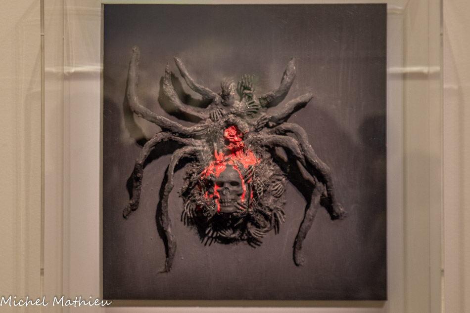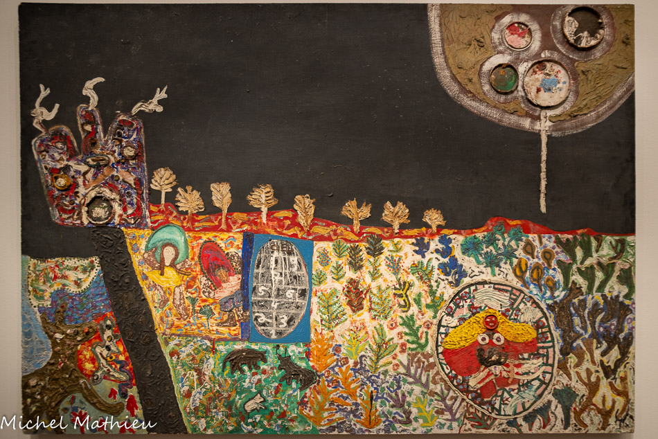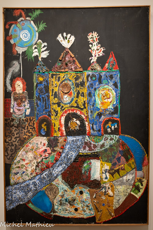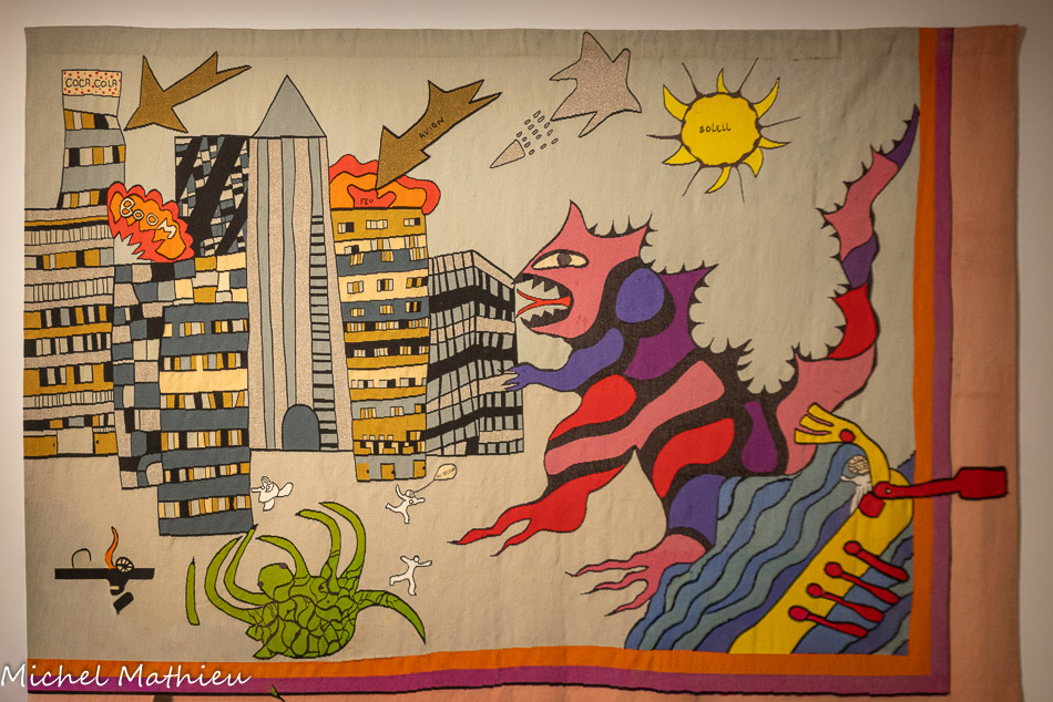 parfois interprété comme prémonitoire des attentats du 11 septembre 2001 – on peut distinguer des avions percutant des gratte-ciels. 1972 ou 1975. Tapisserie. Collection particilière.