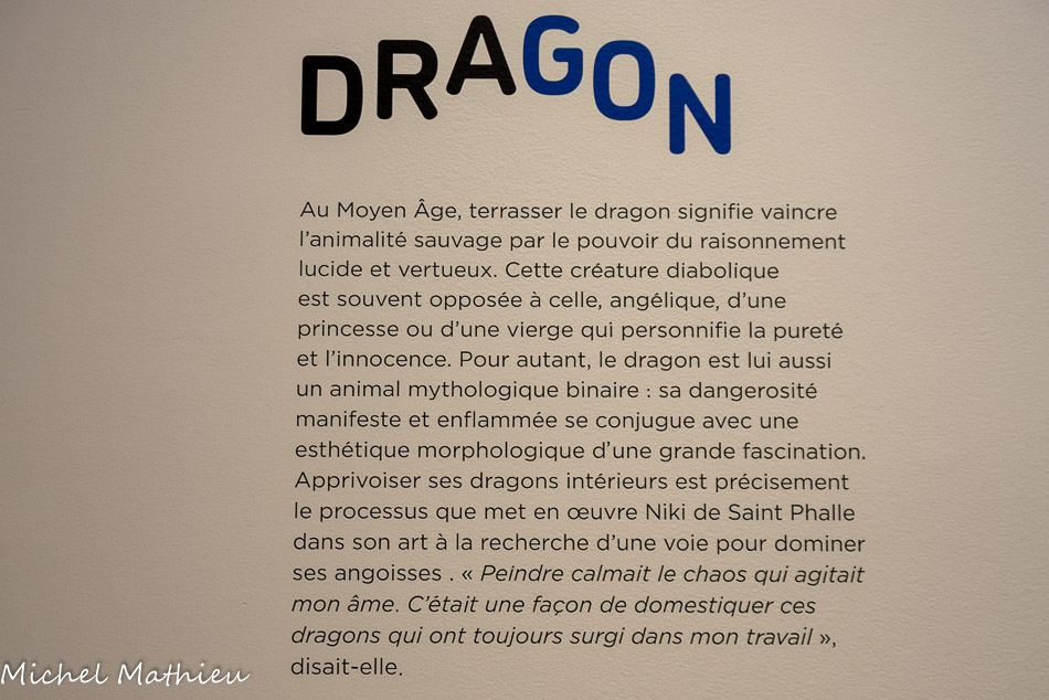 Déjà connue dans la Grèce antique, la licorne l’est surtout au Moyen-Âge qui voit la diffusion de son mythe comme animal bénéfique et salvateur. Dans les tapisseries et les enluminures médiévales, elle symbolise la pureté puisque, selon la légende, seule la présence d’une vierge permet de la capturer. Sa corne possède précieuses propriétés thérapeutiques : elle offre un antidote a tout poison mortel. Dans l’œuvre de Saint Phalle qui représente une femme chevauchant une licorne, l’association avec la figure féminine va dans le sens de la force et de la prospérité plus que de la pureté comme dans l’iconographie médiévale originelle.