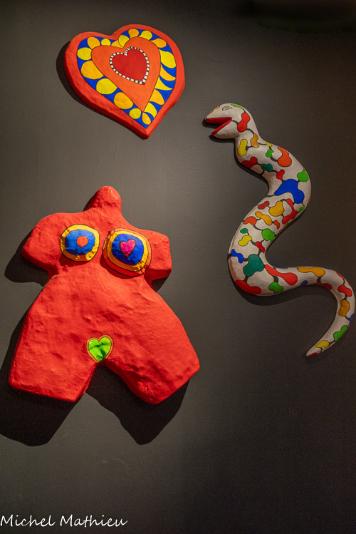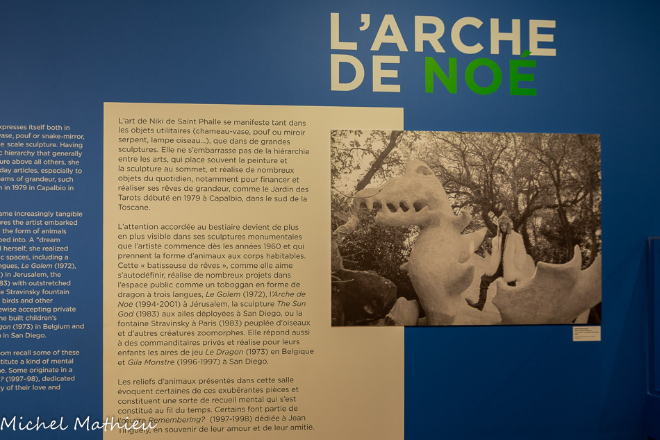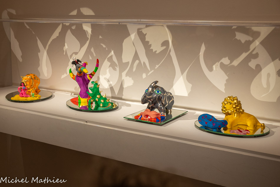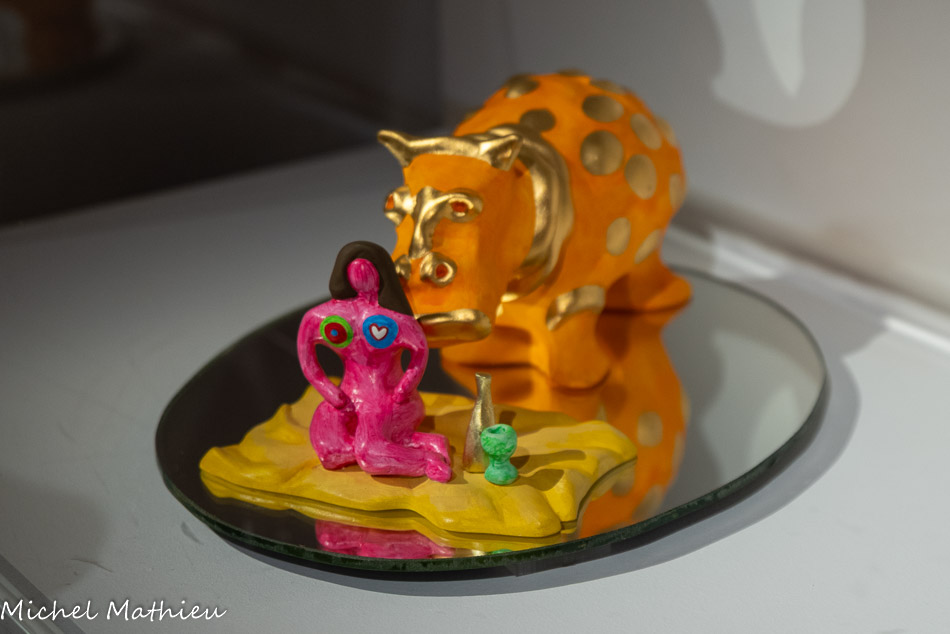 Une relation sereine et harmonieuse entre animaux et femmes est encore illustrée par les petites sculptures que Saint Phalle réalise en 1993 : Portrait de Marina et Éléphant et la dame, deux saynètes où, aux côtés d’une figure féminine, veille un grand mammifère, rhinocéros ou éléphant, gardiens magiques à la fonction apotropaïque. Un sort inverse échoit aux deux hommes représentés dans les œuvres similaires que sont Le Repas du lion et Arbre