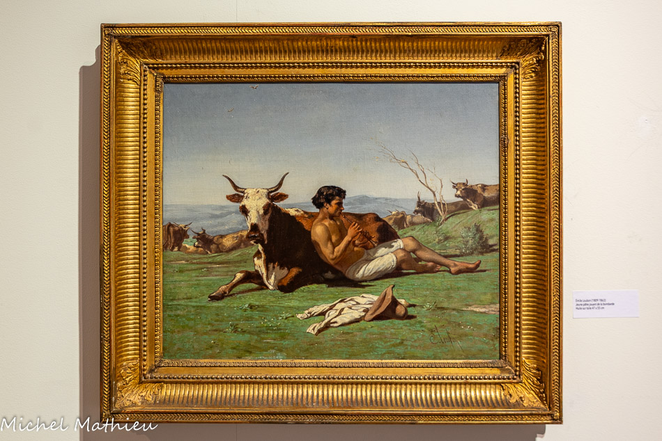 Jeune pâtre jouant de la bombarde. Huile sur toile 47 x 55 cm.