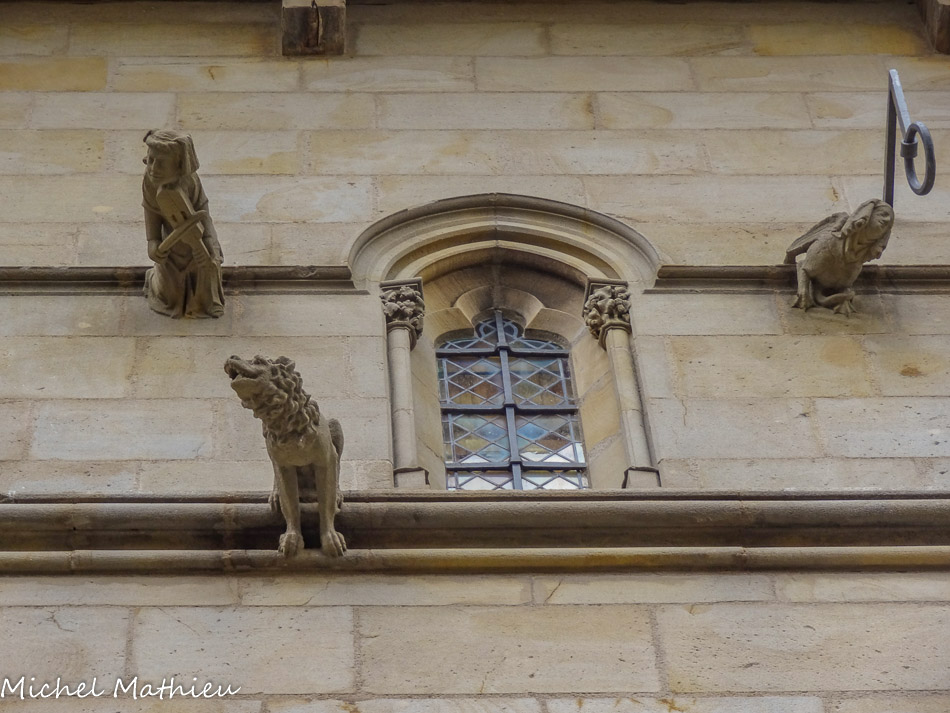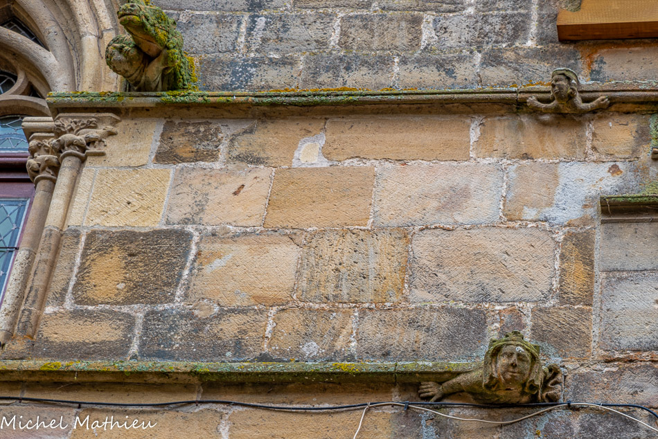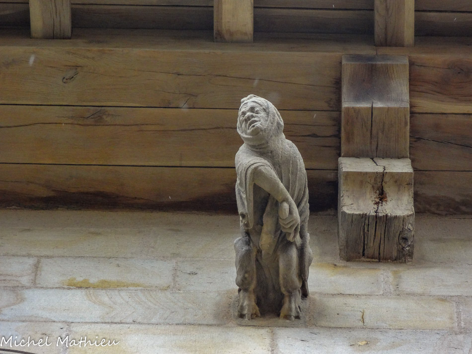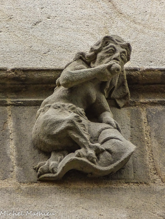 Tête sculptée sur le chapiteau d'une colonnette du deuxième étage.