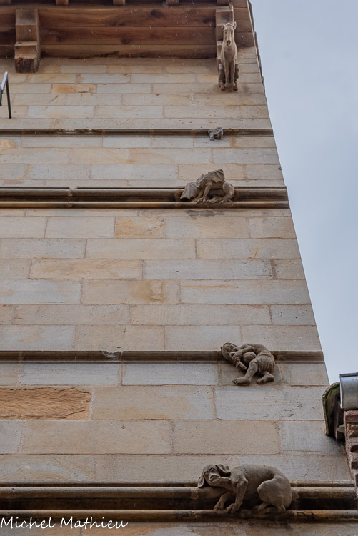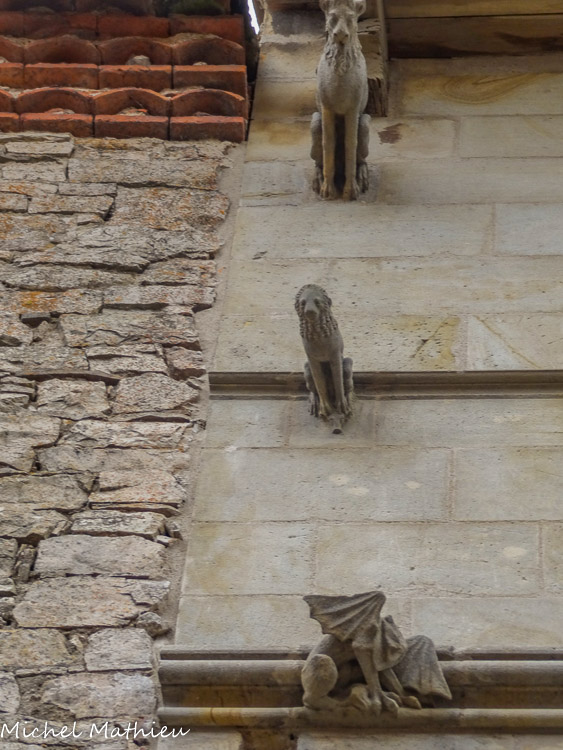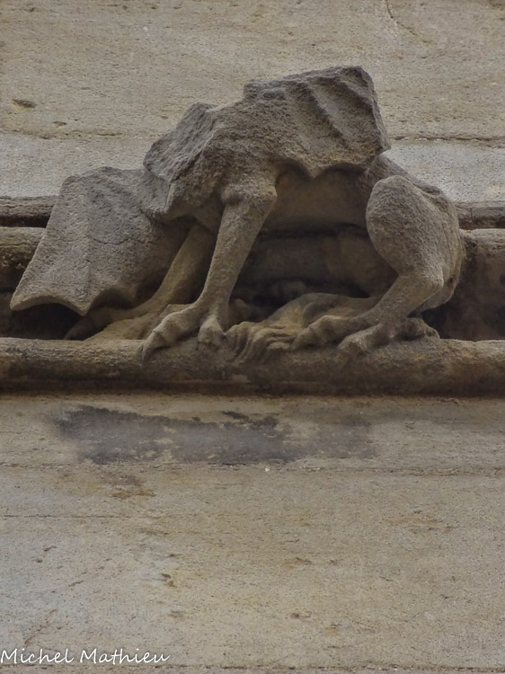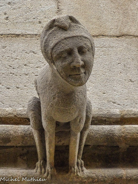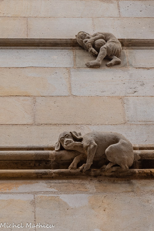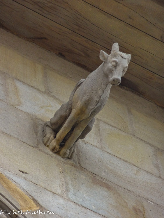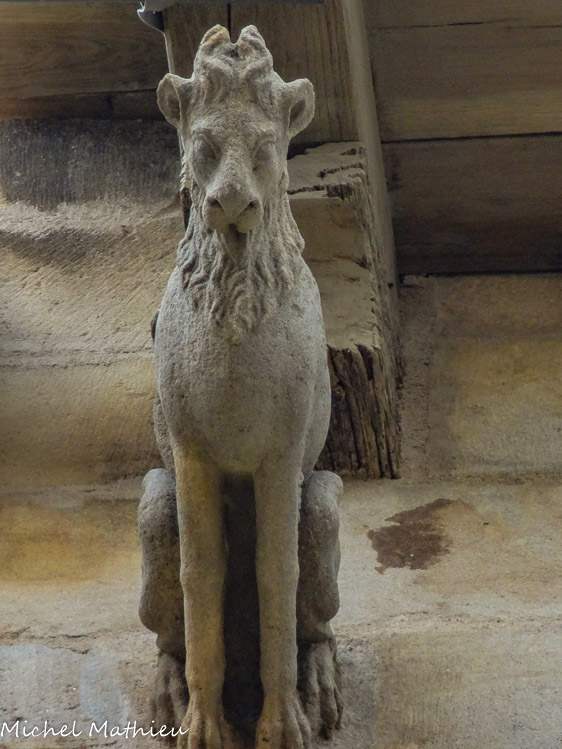 Les chapiteaux sont décorés de manière très variée : feuilles de vigne, d'acanthe, campanules, animaux : chiens chats et une tête humaine.