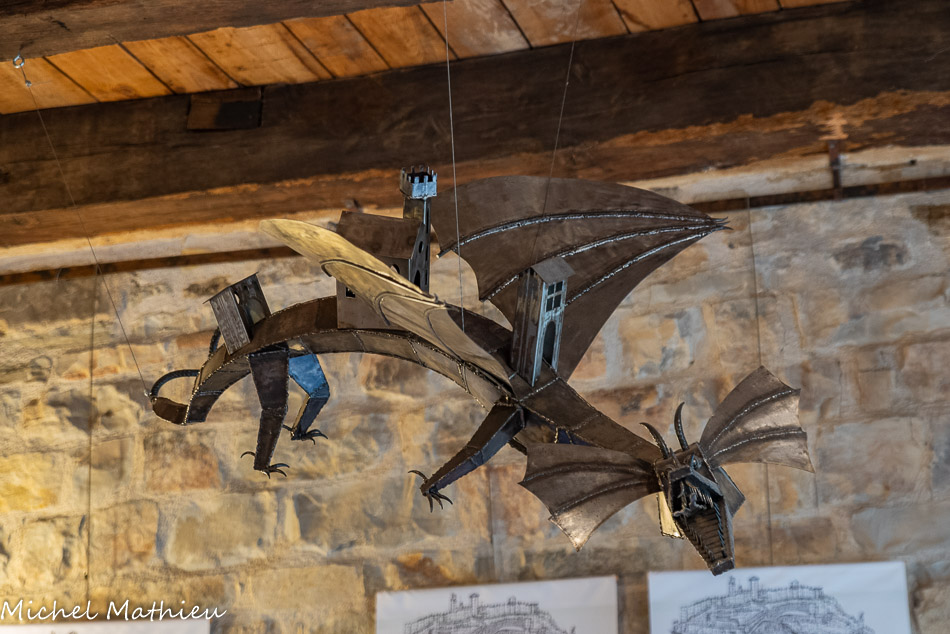 Le chantier médiéval pour la rénovation de la façade nord du musée, avec une grues à roue écureuil pour monter les charges.