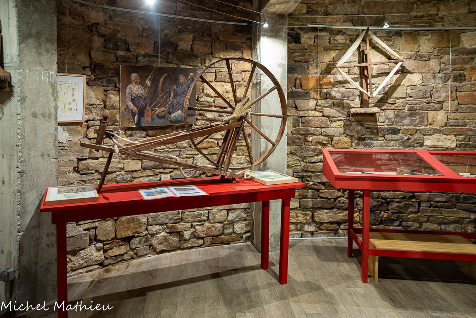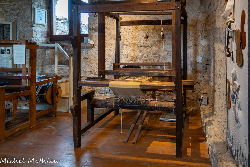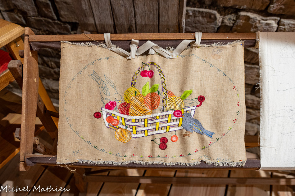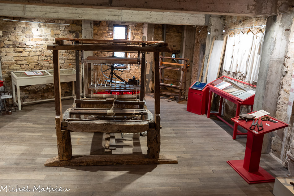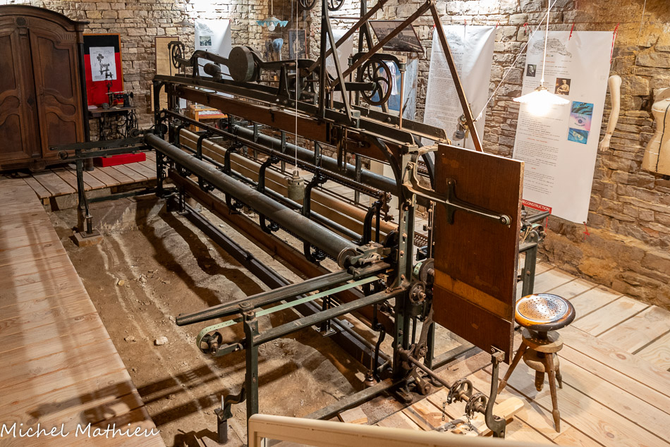 La broderie cordaise. Salle de la broderie. Cette salle a été aménagée pendant l’hiver 2018-2019. Elle accueille l’imposant métier à broder de type « Saint Gall » qui était exposé au MAMC depuis 1985. Le métier se trouve au dessus des fondations des premières maisons cordaises facilement observables.