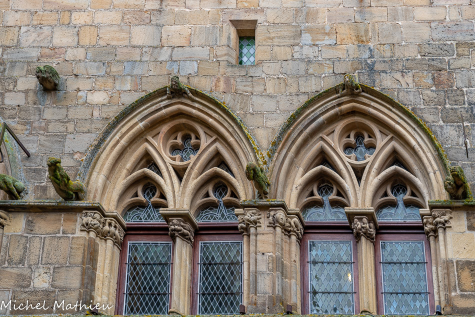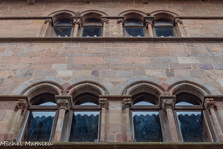 Au rez-de-chaussée, elle est ouverte sur cinq arcades en ogive. Au premier étage, les baies sont réparties en deux groupes de deux paires. Celles du second étage sont agencées de la même manière, alignées sur celles du premier étage.