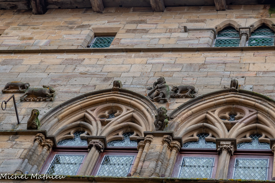 Certains des ancêtres du propriétaire qui a fait construire cette maison, ont péri sur le bûcher et sa maison porte des sculptures qui racontent, de façon cachée, la chasse aux Cathares (personnifiés par des visages effrayés). Cette persécution fut menée par les Dominicains qui se nommaient eux-mêmes « les chiens du Seigneur ». Voyez la scène de chasse, sculptée sur la façade, à la lumière de cette explication : les chiens (les Dominicains) poursuivent le cathare qui détient selon lui la vraie spiritualité (le sanglier) et va parvenir à l’arbre de la connaissance (le pommier). Le chien-inquisiteur a perdu la trace du Christ (le cerf) et s’arrête langue pendante.