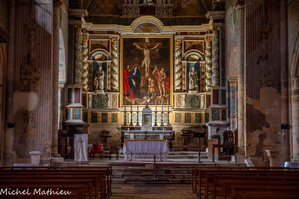 Tableau : le Christ en croix entouré de la Vierge, de Marie-Madeleine, saint Jean et saint Michel, peint par Charles de Raverolles, 1669. Dans les compartiments latéraux, quatre niches avec les statues des quatre évangélistes, en plâtre, de Hérail, 1843. Ce retable a été sculpté par Constans de Rodez en 1679, rénové en 1843. Couronnement : entablement et édicule au-dessus du compartiment central. La corniche est cintrée au-dessus de la toile. Le tympan est orné du triangle entouré de rayons. L’édicule est délimité par quatre colonnes ornées de branches de laurier ; chapiteaux corinthiens ; volutes en appui.
