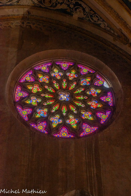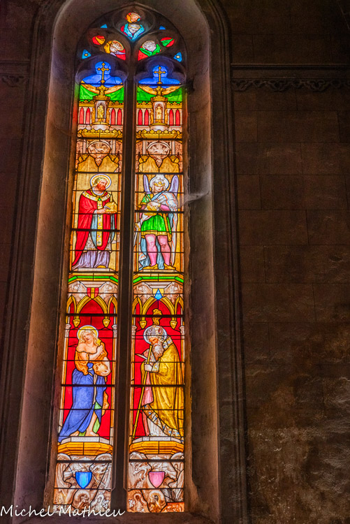 Vitraux peints par Rigaud en 1863. En bas : saint Fabien, saint-Sébastien. En haut : le baptême de Jésus.