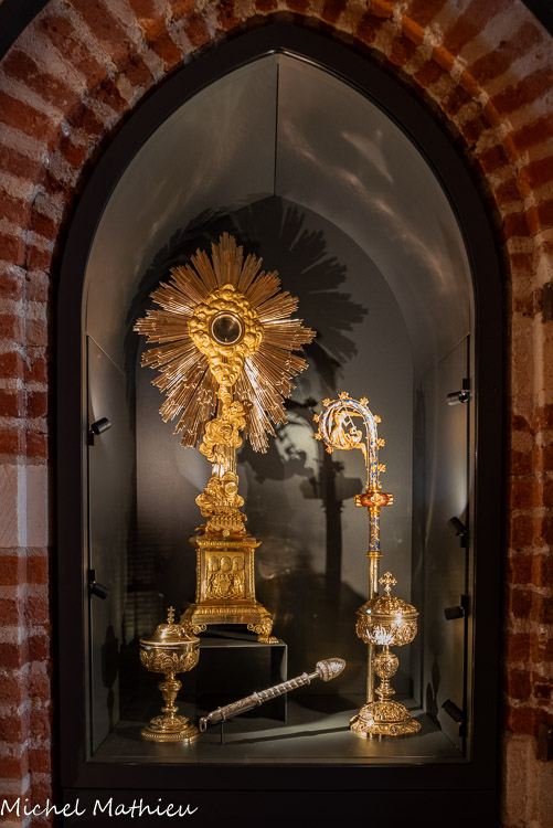 Bronze doré, émail. Cette crosse épiscopale a été réalisée en 1867 par l'orfèvre parisien Placide Poussielgue- Rusand d'après un dessin de Viollet-le-Duc initialement réalisé pour une crosse de la cathédrale Notre-Dame de Paris. Ce modèle, inspiré des crosses médiévales, a largement été copié et diffusé. Ciboire (D).