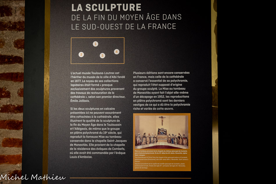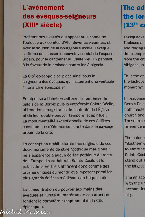 Entrée du musée Toulouse-Lautrec. Après la Révolution, les bâtiments de l'Archevêché deviennent édifice national abritant tour à tour logement de gendarmerie, de prison ou de logement pour l’évêque constitutionnel. A partir de 1797, le palais accueille administration préfectorale, tribunal civil, blibliothèque publique et école. En 1823, le diocèse d'Albi est reconstitué et l'Eglise reprend possession du palais qu’elle doit à nouveau céder à l’Etat avec la promulgation de la loi de Séparation des Eglises et de l’Etat en 1905. Le Palais de la Berbie perd sa destination religieuse et sa propriété revient au département qui permet à la Ville d’en avoir la jouissance sous réserve qu’un musée public y soit ouvert. Les collections du musée installé à l’Hôtel Rochegude y sont transférées puis complétées par la donation des œuvres de Toulouse-Lautrec en 1922. Des travaux sont alors entrepris pour adapter le bâtiment à sa nouvelle fonction muséale et pour restituer son état d’origine.