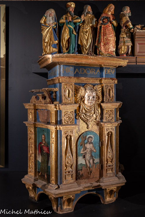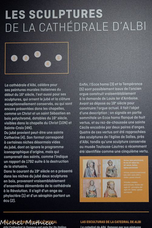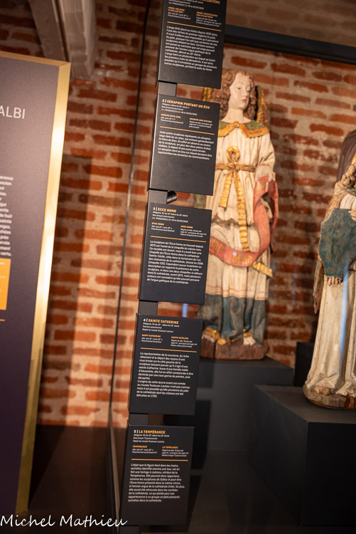 Dans le courant du 19e siècle on a présenté dans les niches du jubé deux sculptures en bois, provenant vraisemblablement d'ensembles démembrés de la cathédrale à la Révolution. Il s'agit d'un ange au phylactère (1) et d'un séraphin portant un écu (2). Enfin, l'Ecce homo (3) et la Tempérance (5) sont possiblement issus de l'ancien orgue construit vraisemblablement à la demande de Louis 1er d'Amboise. Du jubé provient peut-être une sainte Catherine (4). Son format correspond à certaines niches désormais vides du jubé, dont on ignore le programme iconographique d'origine, mais qui comprenait des saints, comme l'indique un rapport de 1792 suite à la destruction de la statuaire.