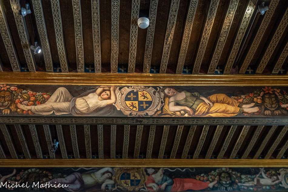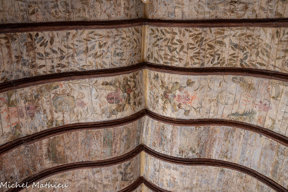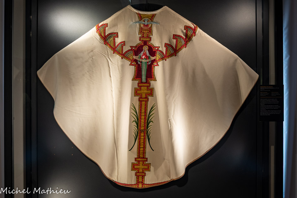 L'arrière de la chasuble figure la colombe du Saint-Esprit descendant vers sainte Cécile. Les palmes nouées sur le bas rappellent son martyre.