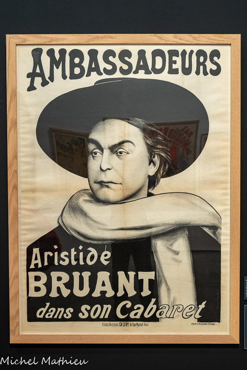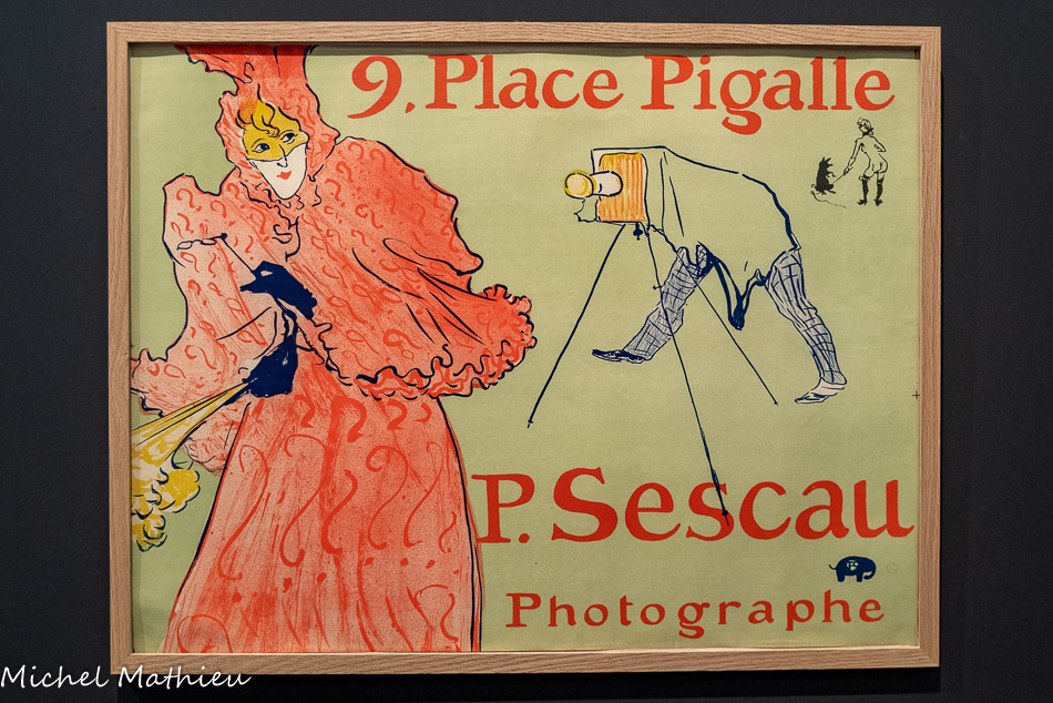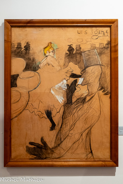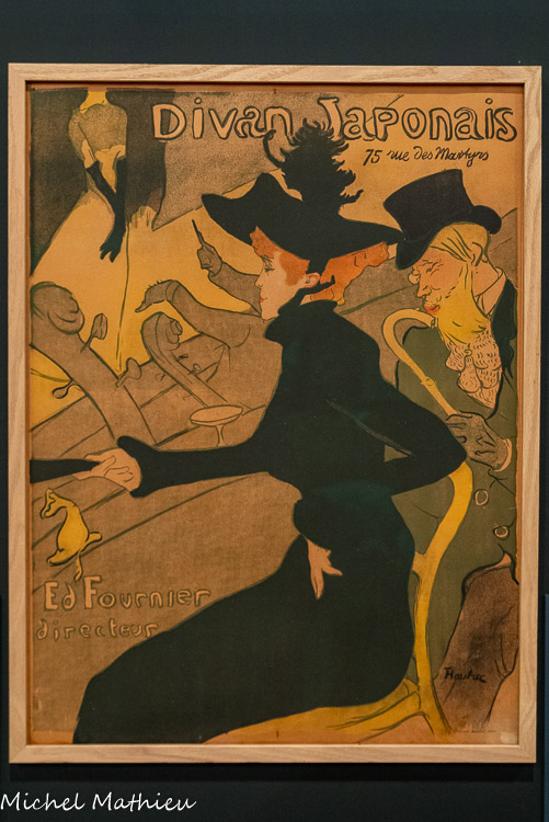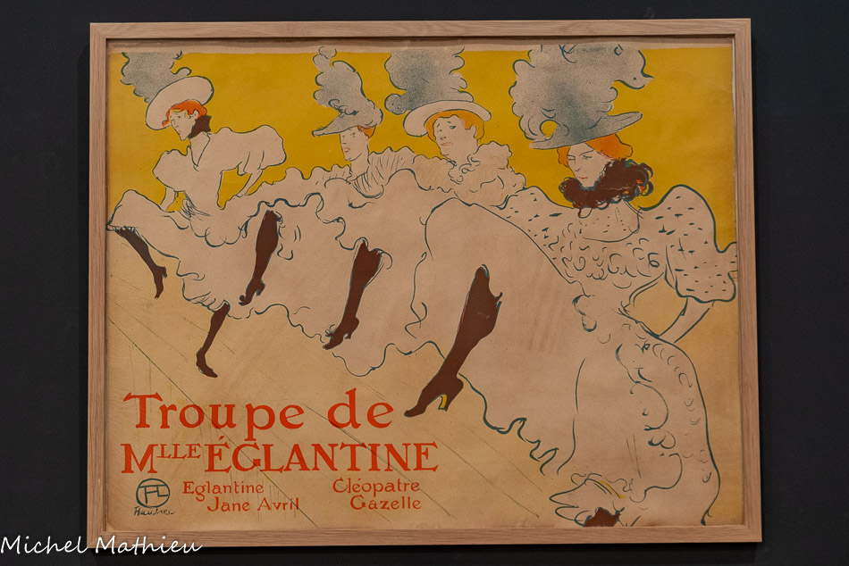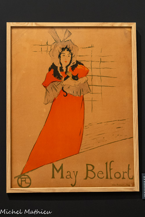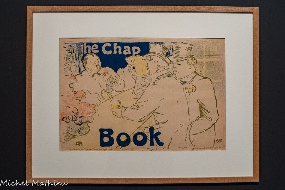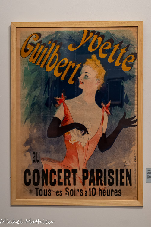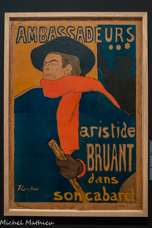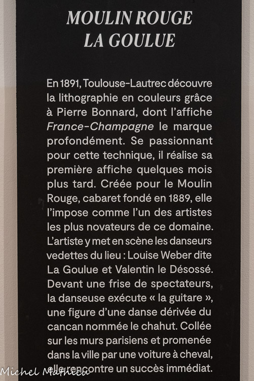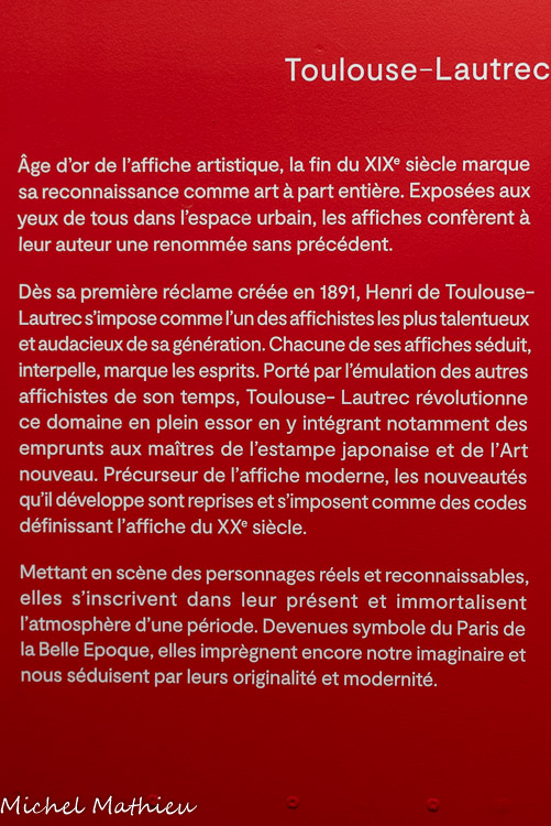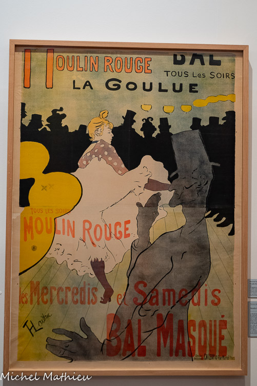 Paris, musée Carnavalet-Histoire de Paris. La première affiche du Moulin Rouge est réalisée par Jules Chéret, reconnu comme le père de l’affiche illustrée. Il représente le cabaret par son emblématique silhouette avec ses ailes, et dépeint une ambiance festive qu’animent de jeunes femmes joyeuses et anonymes, les « Chérettes ». Il conserve ce principe pour sa seconde affiche. La photographie en début de parcours, montrant Toulouse-Lautrec devant l’affiche de Chéret, questionne : symboliserait-elle la présentation du modèle à suivre ou de celui à dépasser ? Toulouse-Lautrec a quant à lui choisi de mettre en scène les danseurs à l’intérieur du cabaret dans une composition originale et audacieuse.