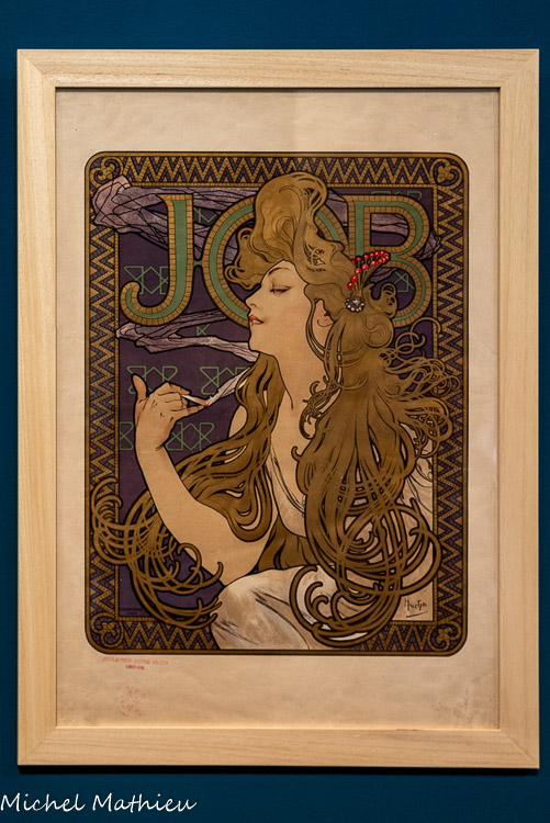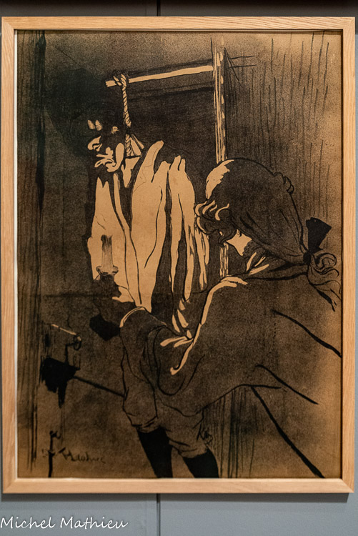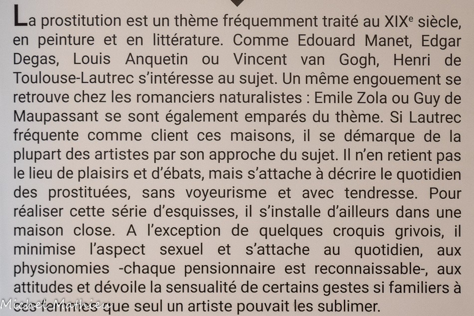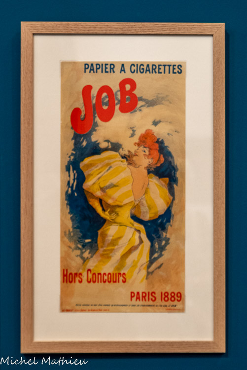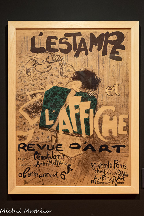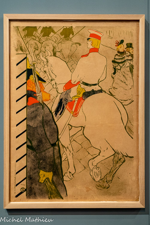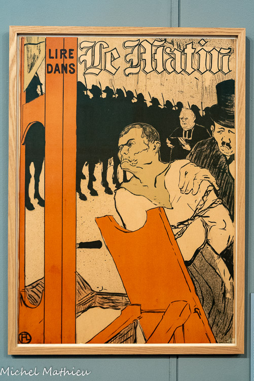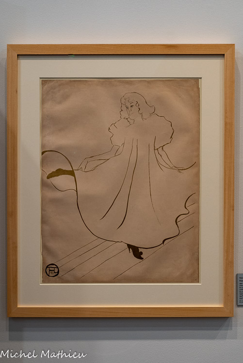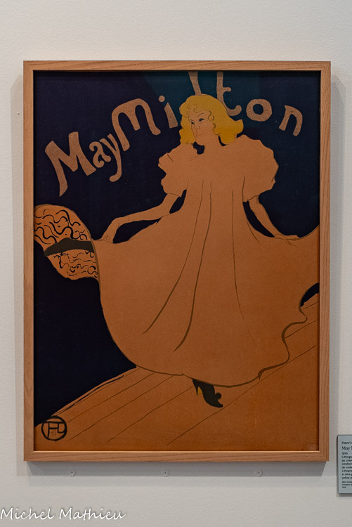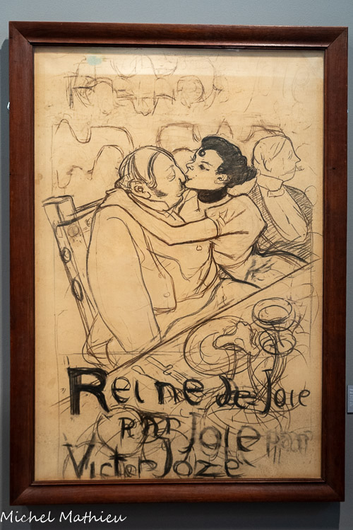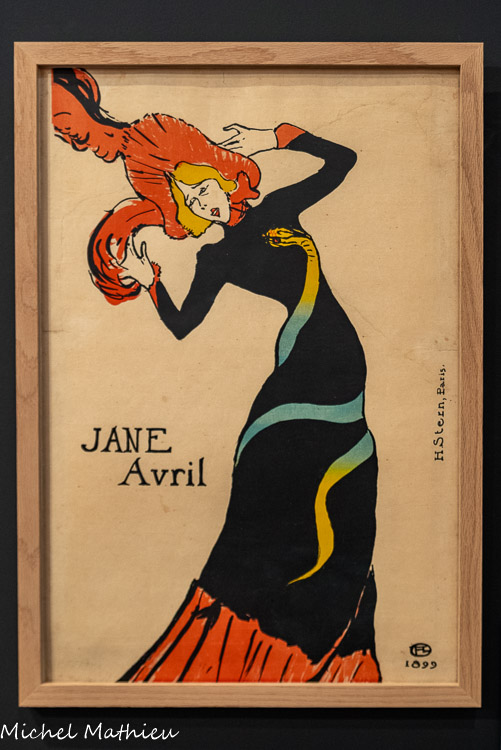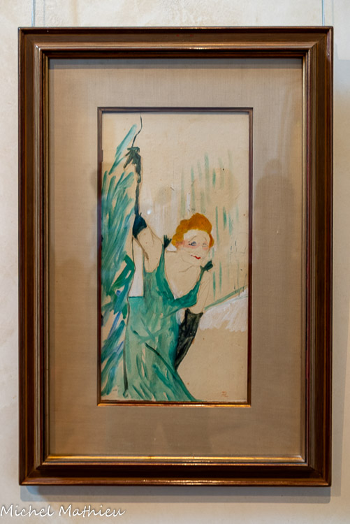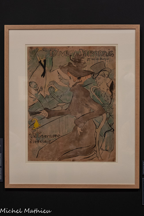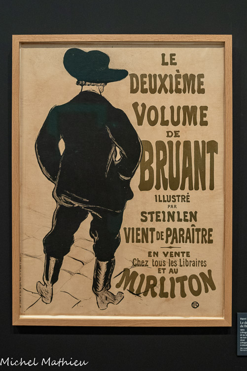 Paris, musée Carnavalet-Histoire de Paris. La première affiche du Moulin Rouge est réalisée par Jules Chéret, reconnu comme le père de l’affiche illustrée. Il représente le cabaret par son emblématique silhouette avec ses ailes, et dépeint une ambiance festive qu’animent de jeunes femmes joyeuses et anonymes, les « Chérettes ». Il conserve ce principe pour sa seconde affiche. La photographie en début de parcours, montrant Toulouse-Lautrec devant l’affiche de Chéret, questionne : symboliserait-elle la présentation du modèle à suivre ou de celui à dépasser ? Toulouse-Lautrec a quant à lui choisi de mettre en scène les danseurs à l’intérieur du cabaret dans une composition originale et audacieuse.
