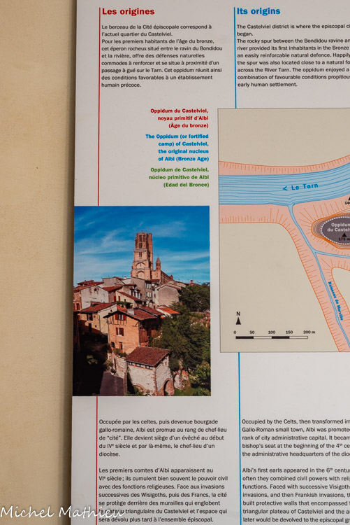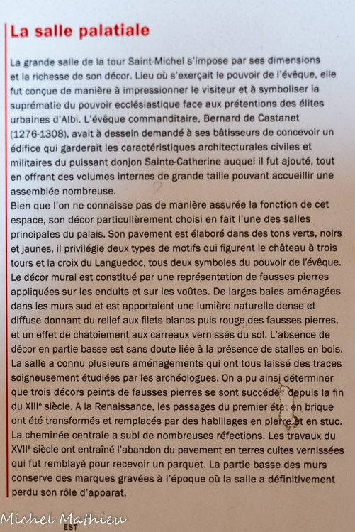 Durand de Beaucaire (1228-1254). Jusqu’au début du XIIIe siècle, les évêques d’Albi habitent un groupe de maisons proche de la cathédrale romane prêté par les chanoines. Les évêques vont profiter de la déchéance des vicomtes d’Albi, les Trencavel, lors de la croisade des Albigeois, pour réorganiser à leur profit la perception des impôts. Cet enrichissement soudain permet à l’évêque Durand de Beaucaire de marquer sa puissance au travers d’une nouvelle résidence. Elle se compose d’une salle féodale (aula) à laquelle est accolée une tour ; à l’ouest est édifiée la tour Saint-Michel (à deux niveaux) destinée au tribunal et aux prisons ecclésiastiques