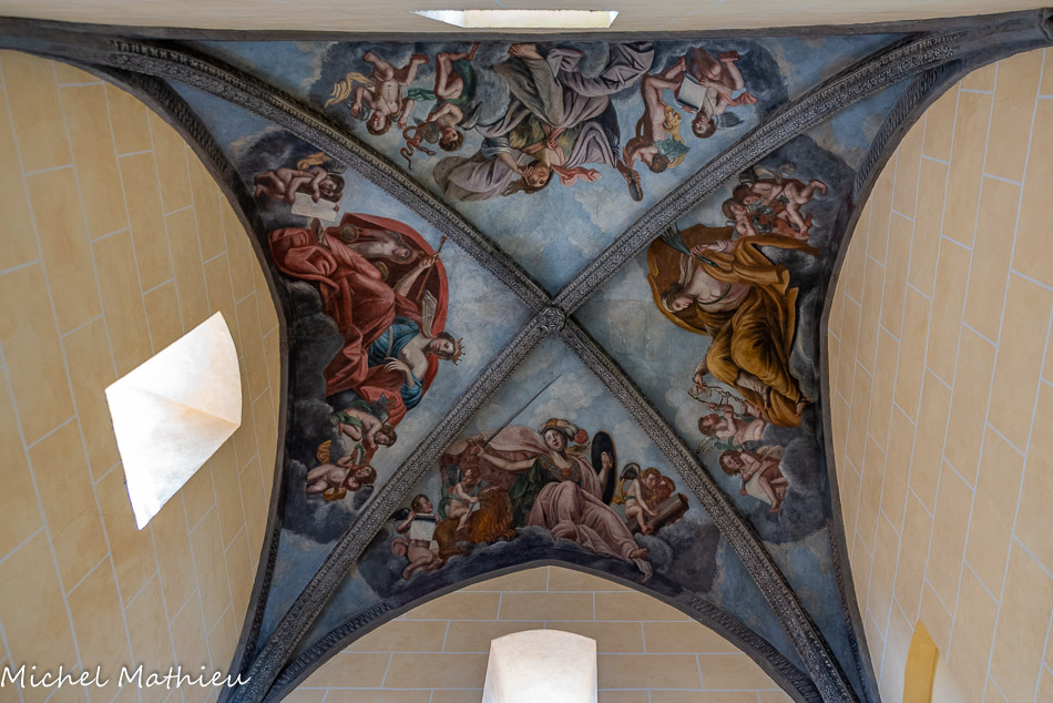 Sur le voile, deux anges agenouillés portent les objets symbolisant la royauté (couronne, sceptre, bâton de commandement) surmontés par l'inscription Tu rex gloriae Christie, «toi, roi, Christ de gloire ».