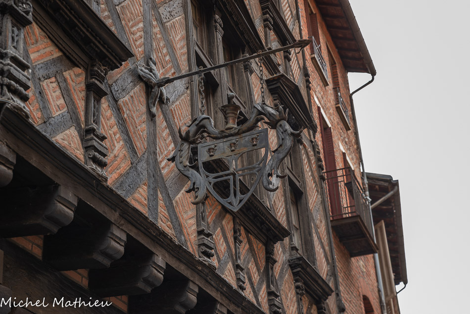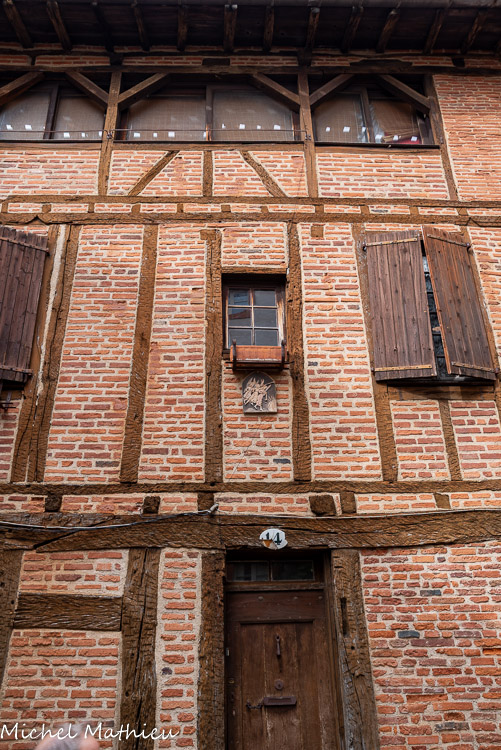 Maison Enjalbert (XVIe siècle). Elle possède la structuré des maisons traditionnelles à colombage, mais la mise en œuvre de la brique, particulièrement élaborée témoigne du soin accordé au montage des murs à l’époque de la Renaissance.