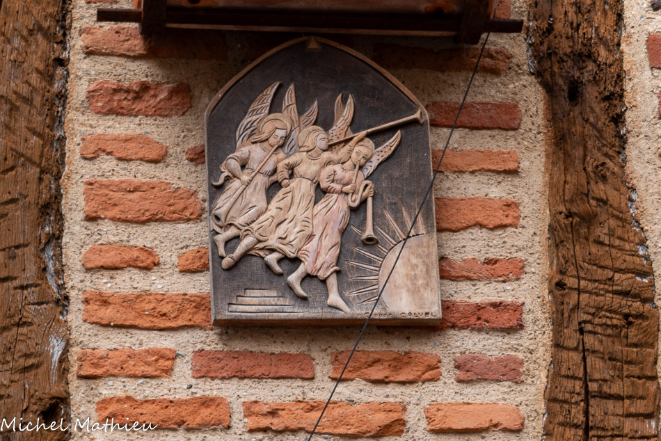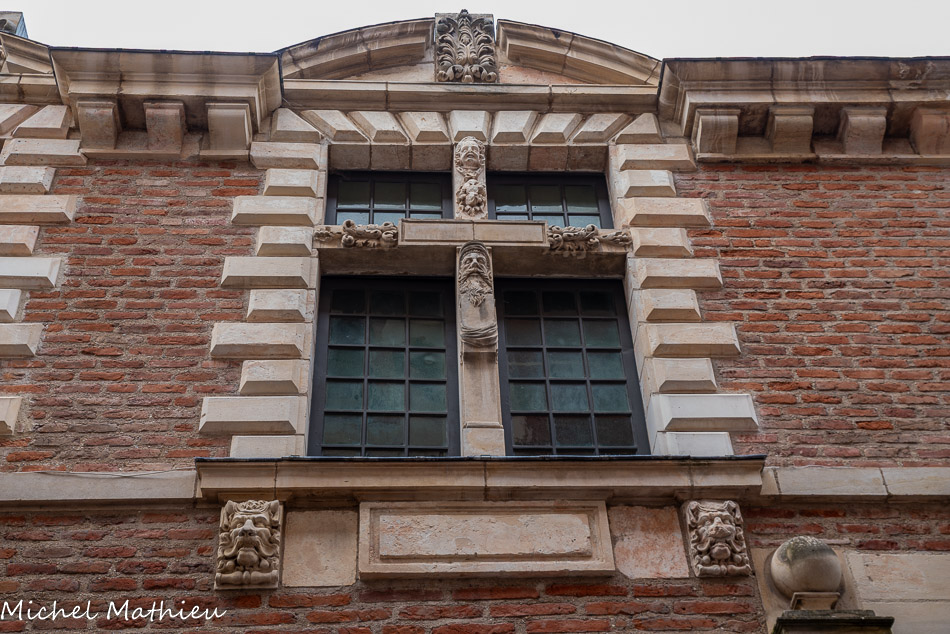 L’Hôtel de Ville (XVIIe siècle). Le premier étage est percé d'une fenêtre à meneaux, à encadrement en briques, de même que les pilastres. Les meneaux portent des sculptures.