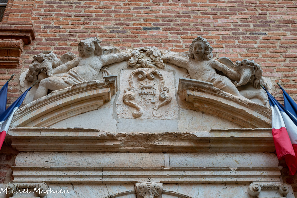 L’Hôtel de Ville (XVIIe siècle). La cour comporte une belle porte de décor Renaissance. Les armoiries de la ville y sont représentées, elles illustrent la devise imprimée en 1764 dans l'armorial des Etats du Languedoc : « stat baculus,vigilatque leo, turresque tuetur », La crosse de l'évêque se dresse, le lion veille et protège les tours. Depuis 1397, la maison commune d'Albi se trouvait dans la carrière de la Sabaterie. Elle fut transférée dans l'hôtel de messire Etienne de Martin en 1728, son emplacement actuel. L'hôtel existait avant sa transformation en maison commune, comme l'atteste la date de 1682 gravée au fronton de la porte d'escalier.