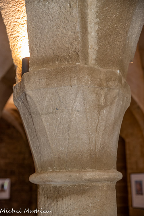 Le cellier. Un chapitaeu avec vestiges de décoration.