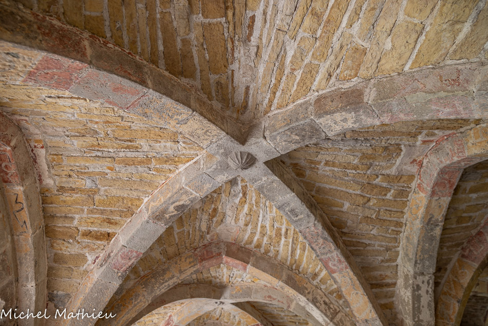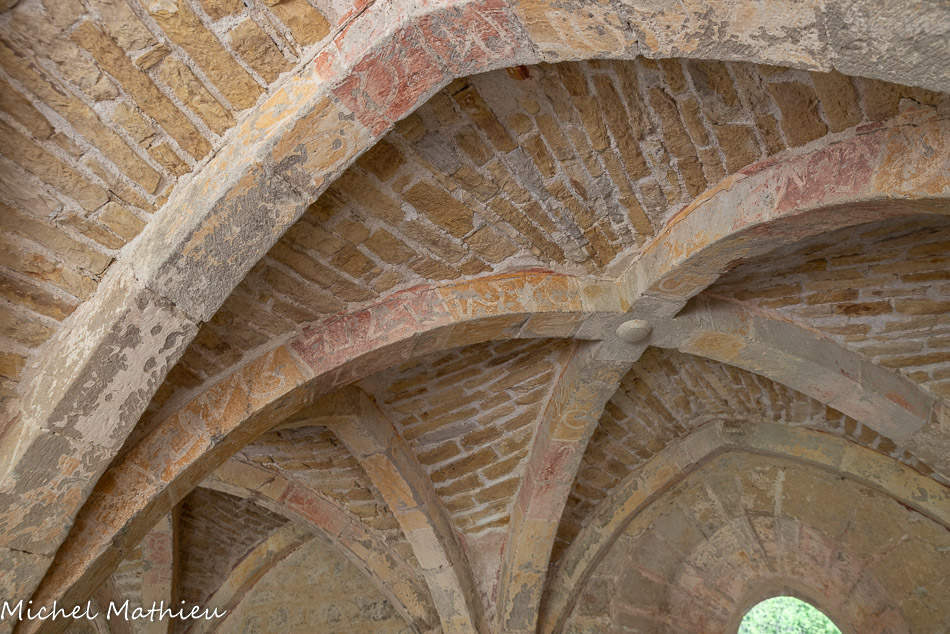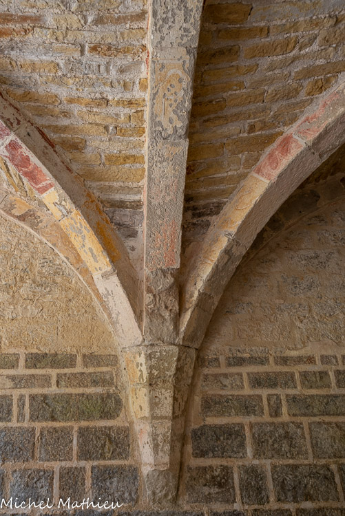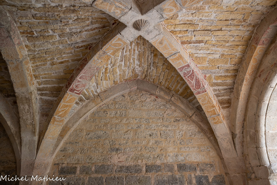 La salle capitulaire. Les voûtes étaient ornées de décors peints ocre et rouge, dont il reste quelques traces sur les arcs en ogive.