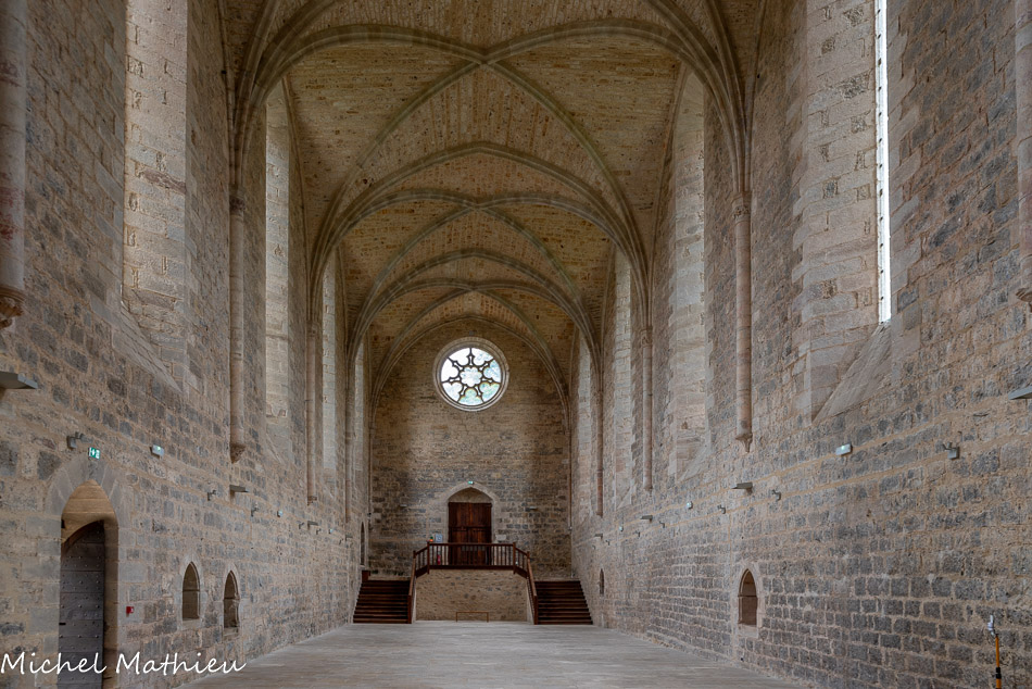 Cette vaste pièce, à la voûte en berceau brisé, était percée de baies côté sud. Seule persiste celle qui éclairait la chaire du lecteur.
