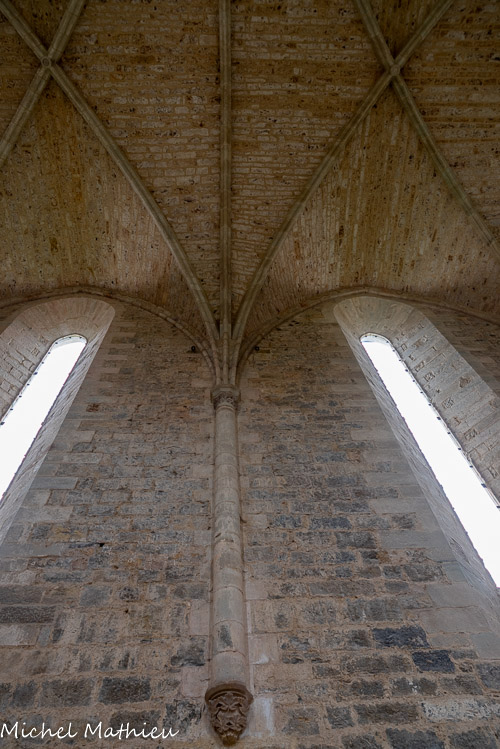 Le chœur. L’abbatiale est composée d’une longue nef a vaisseau unique, éclairée par de hautes baies dites « en lancettes ».