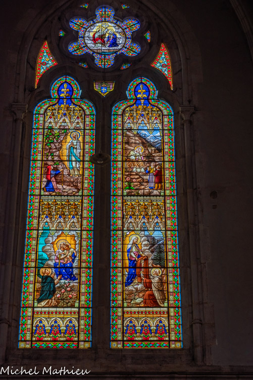 En haut, apparition du Sacré-Coeur à sainte Marguerite Marie Alacoque. A gauche, la nativité et la Sainte Famille dans l'atelier de Saint Joseph. A droite, le Christ et les enfants, la mort de Saint Joseph. Dagrant Pierre-Gustave (peintre-verrier), 4e quart 19e siècle.