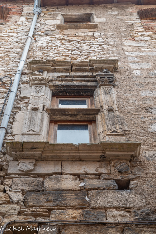 Les fenêtres, sobres et modernes, sont à coussièges. La qualité ornementale de la cheminée est illustrée par les chapiteaux à crochets, typiques du gothique royal du XIIIe siècle. A gauche, l'esplanade.