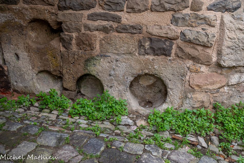 Basse-cour, sentier des Bonshommes. Dès la fin du XIIe siècle, le site fortifié de Penne est fréquenté par les "Bons Hommes" et les "Bonnes Dames", ces dissidents religieux chrétiens plus connus aujourd'hui sous le nom de "cathares" ou "Albigeois". Vers 1170-1190, il existait déjà sur le site initial du village de Penne, construite sur les terrasses où nous sommes, une maison de "Bonnes Dames" issues de la noblesse locale. Tout au long de la Croisade contre les Albigeois (1209-1229), et bien longtemps après la fin de ce conflit jusqu'au milieu des années 1250, les chevaliers de Penne, tels Bernard de Penne et son épouse Pétronille ou Matfré Amiel de Penne, ont offert un refuge aux "Bons Hommes" et "Bonnes Dames" traqués par les agents de l'Inquisition. Ils leur ont proposé le gîte et le couvert, ont assisté en famille à leurs prédications et leur ont permis de fuir dans la clandestinité vers le Quercy tout proche, via le port de Penne. Pour les avoir aidés ou pratiqué leur foi, certains d'entre eux furent à leur tour dénoncés aux inquisiteurs et condamnés, parfois à des peines sévères, comme celle du Mur, la prison inquisitoriale.