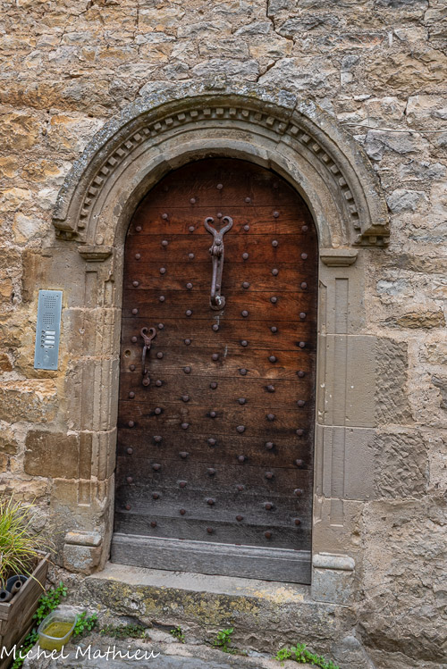 La porterie et la tour à archères. Il n’y a pas de pont-levis, très rare à cette époque. Les archères permettent au tireur de viser des assiégeants en tir à l'arc tendu, frontal ou plongeant à courte portée, ou en tir à l'arc parabolique à plus longue portée.