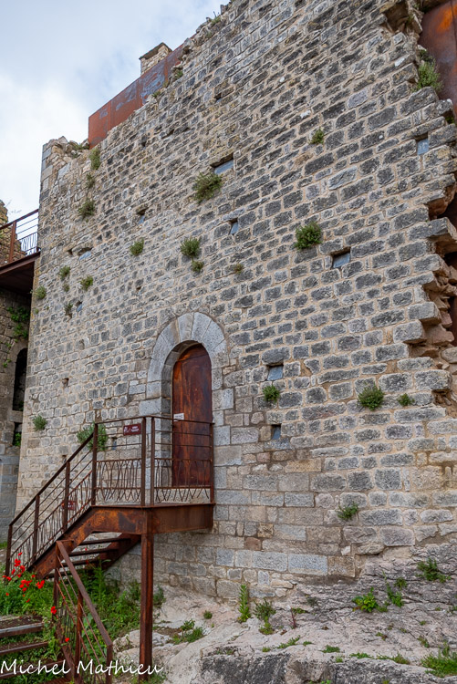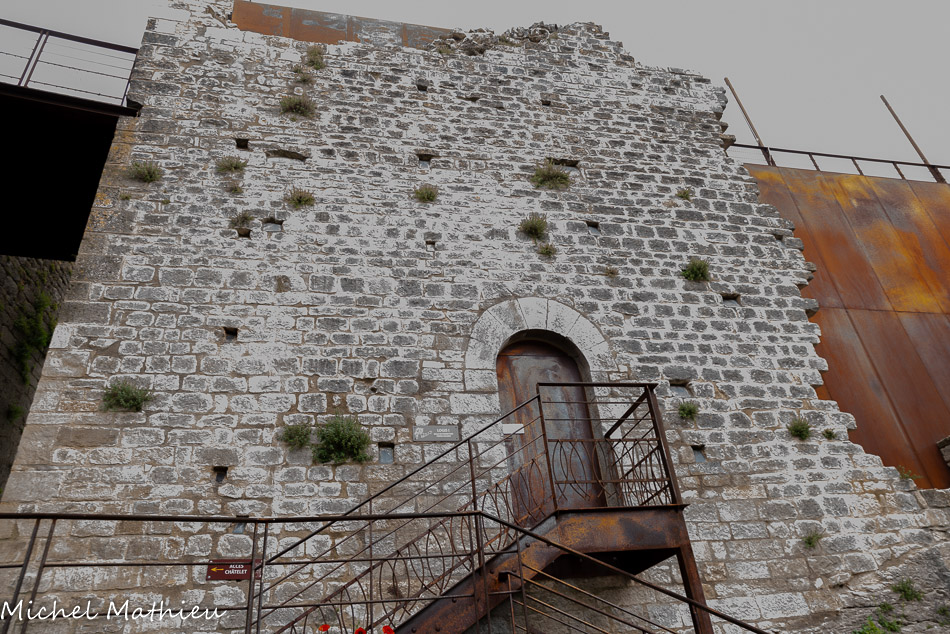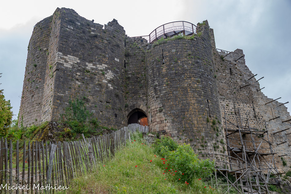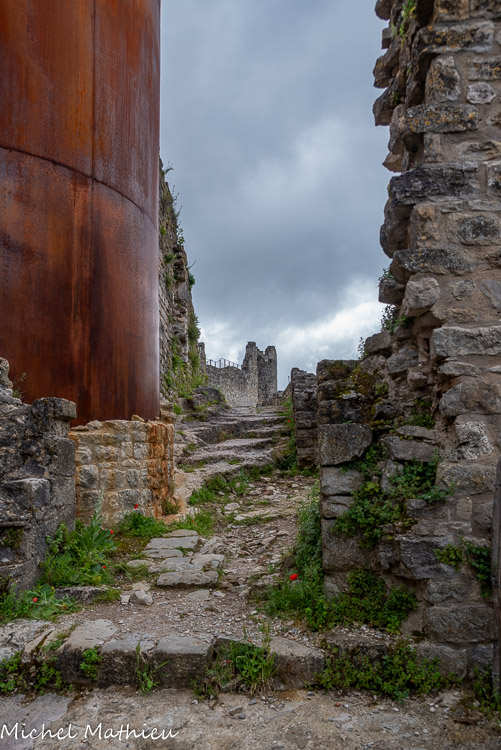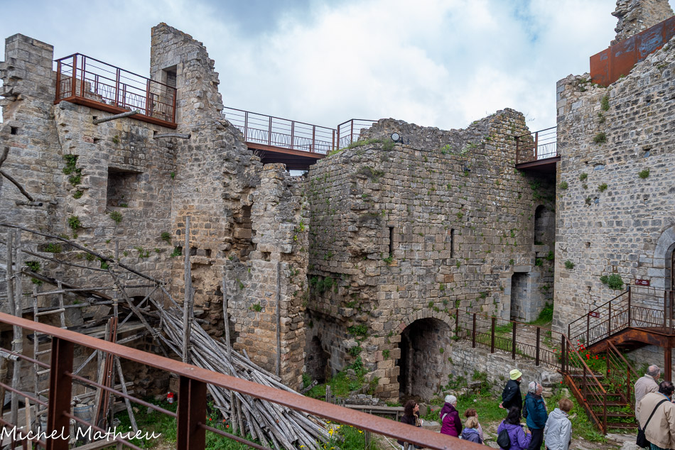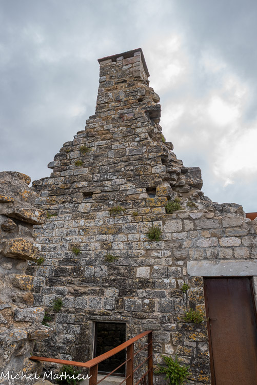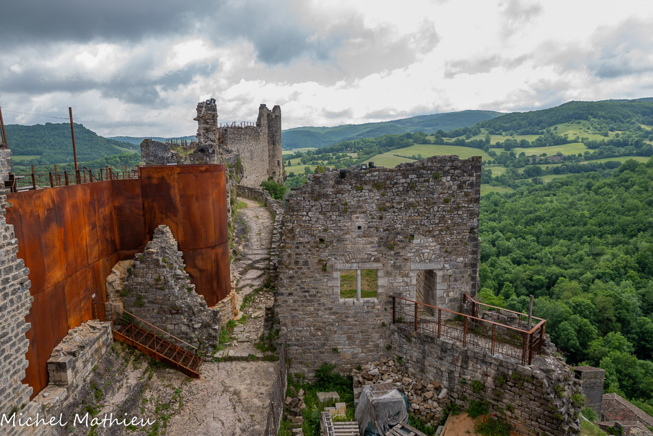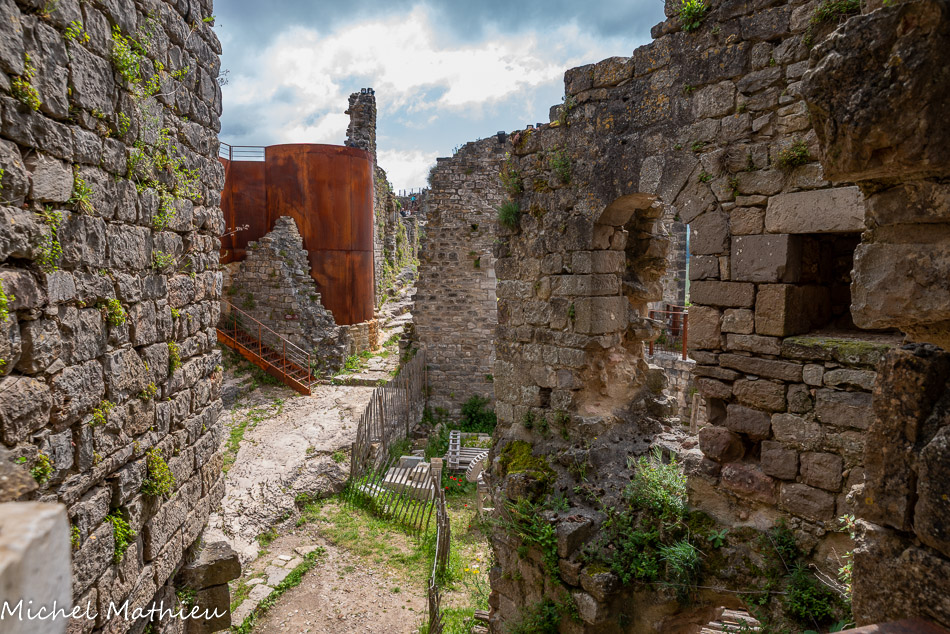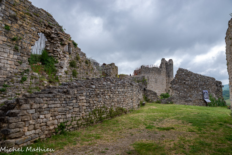 Vue du 2sd étage de la tour à archères. Au bout, le donjon. A gauche, le musée en acier corten. Au centre, le mur de la Grande Salle.