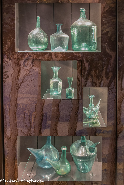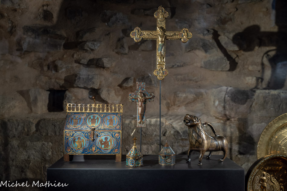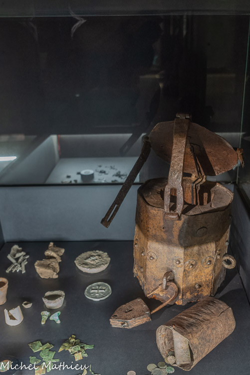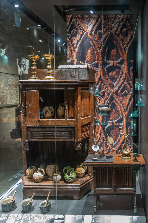 La bobèche, dans laquelle la bougie était placée, est formée d’une cuvette accueillant une pique en fer riveté. Le Dressoir, premier tiers du XVIe siècle Bois de chêne, fer forgé Flandres. Le dressoir est un meuble servant à exposer la vaisselle (à la « dresser ») aux invités. En bas, Pichets médiévaux. XIIIe et XVe siècle. Terre vernissée, terre cuite et grès, France et Normandie. Au Moyen-Âge, le pichet fait partie du service vaisselle avec le gobelet, le bol, l'assiette ou encore l'oule (marmite). Il est notamment utilisé pour servir le vin. Ici présence d’un pichet pégau qui est un récipient ventru avec une anse fixée sur le bord et appliquée à mi-panse qui servait à tirer le vin des tonneaux. Mortiers et pilons XVIe-XVIIe siècle, Bronze . Le pilon, associé au mortier (récipient), permettait de broyer des aliments, minéraux, plantes.
