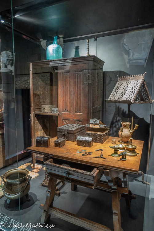 Petit banc. XVe siècle. Bois de chêne Flandres. Les panneaux en « parchemin plissé » ou « plis de serviette », comme sur la façade du banc ici, s’inspirent des formes que prend le cuir en se racornissant. A droite, Chandelier à double branches pivotantes muni de binet (petit ustensile qu'on met dans le chandelier permettant de brûler la bougie jusqu'à la fin) repercé. XVe siècle. Flandres. Laiton. Un pique-cierge est un chandelier comportant une pique pour embrocher les bougies. Cuillères à ragout Cuillères individuelles XVe siècle Bronze. Souvent chacun portait sa cuillère sur lui, comme on porte de nos jours un couteau de poche. Puisette, XVIe siècle, bronze. La puisette est une sorte de marmite suspendue avec deux becs verseurs ; elle servait au lavage des mains.