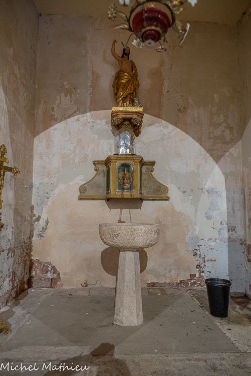 Les fonts baptismaux et la statue de Saint Jean-Baptiste.