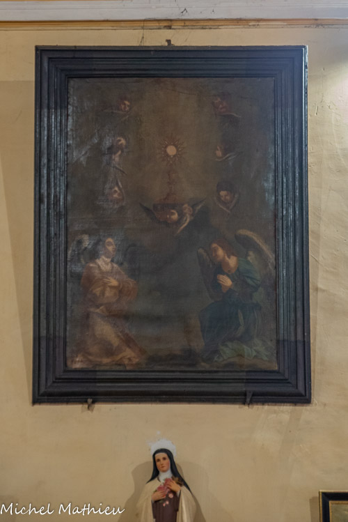Les deux tableaux encadrant le retable représentent des martyrs. Sur la droite, Ste Apolline, tuée au troisième siècle; elle tient