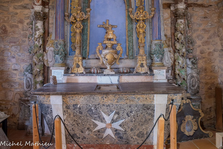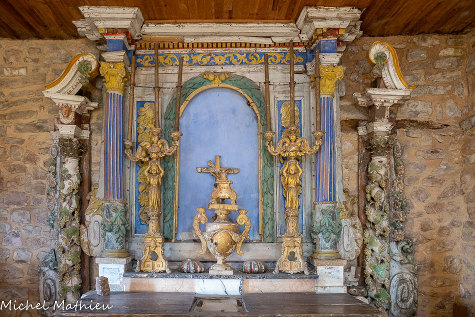 La chapelle dédiée à la Vierge, et datée de 1768. L’autel, fait de stuc peint - un matériau très fragile - est une survivance de l’époque