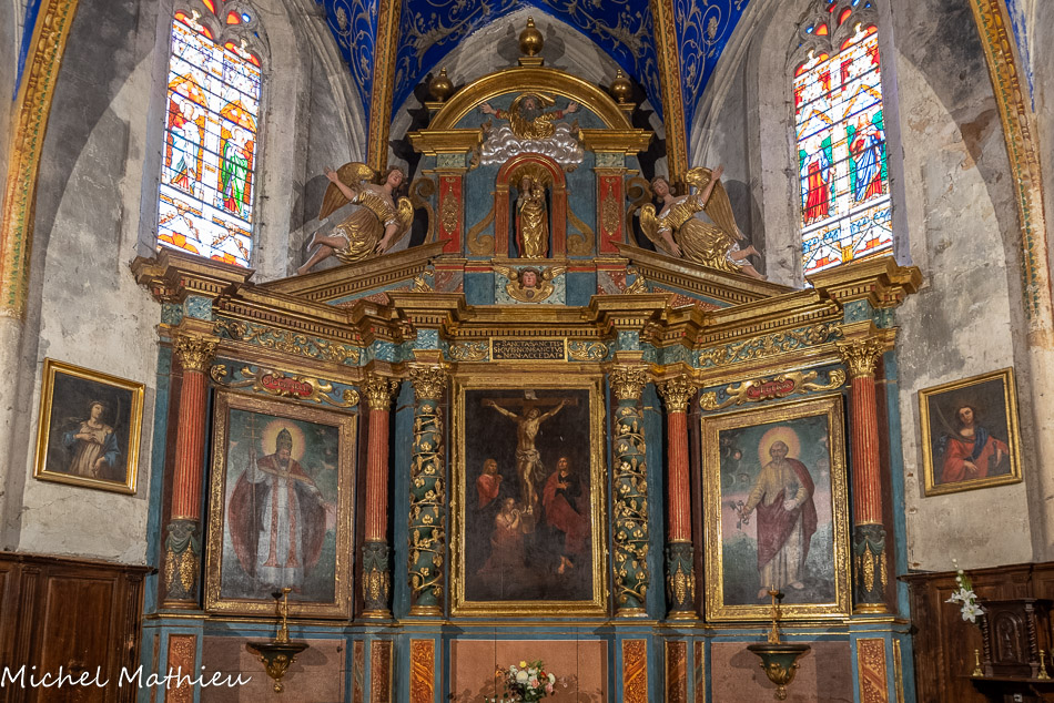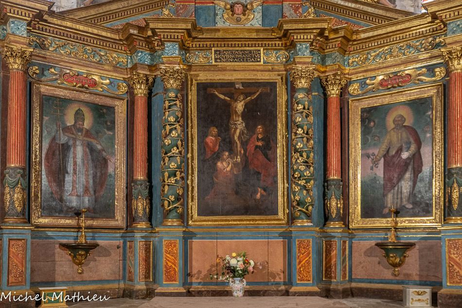 En bas au centre un tableau représentant la descente de Croix entourée de Marie et Marie Magdeleine. Tableau réalisé à cette occasion. En bas à droite, Saint Pierre. Retable à trois compartiments, logeant trois tableaux, séparés par 6 colonnes à chapiteau d'ordre corinthien : 4 cannelées, 2 torses. Encadrant le tableau central, deux colonnes torses, chargées de guirlandes de feuilles, de sarmenst et de grappes de raisin.
